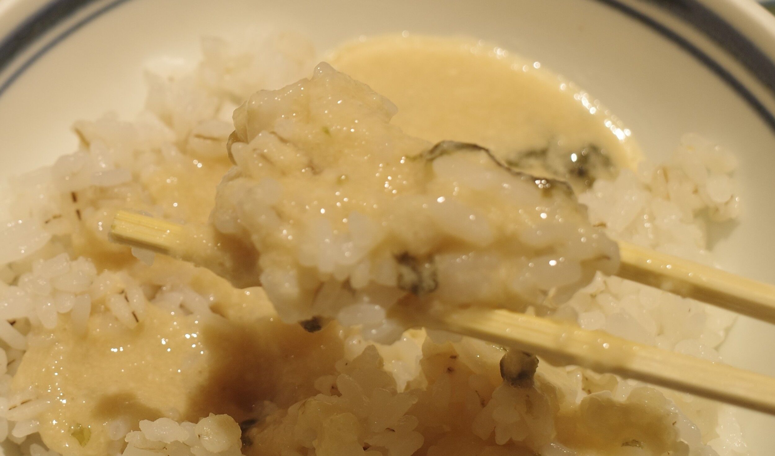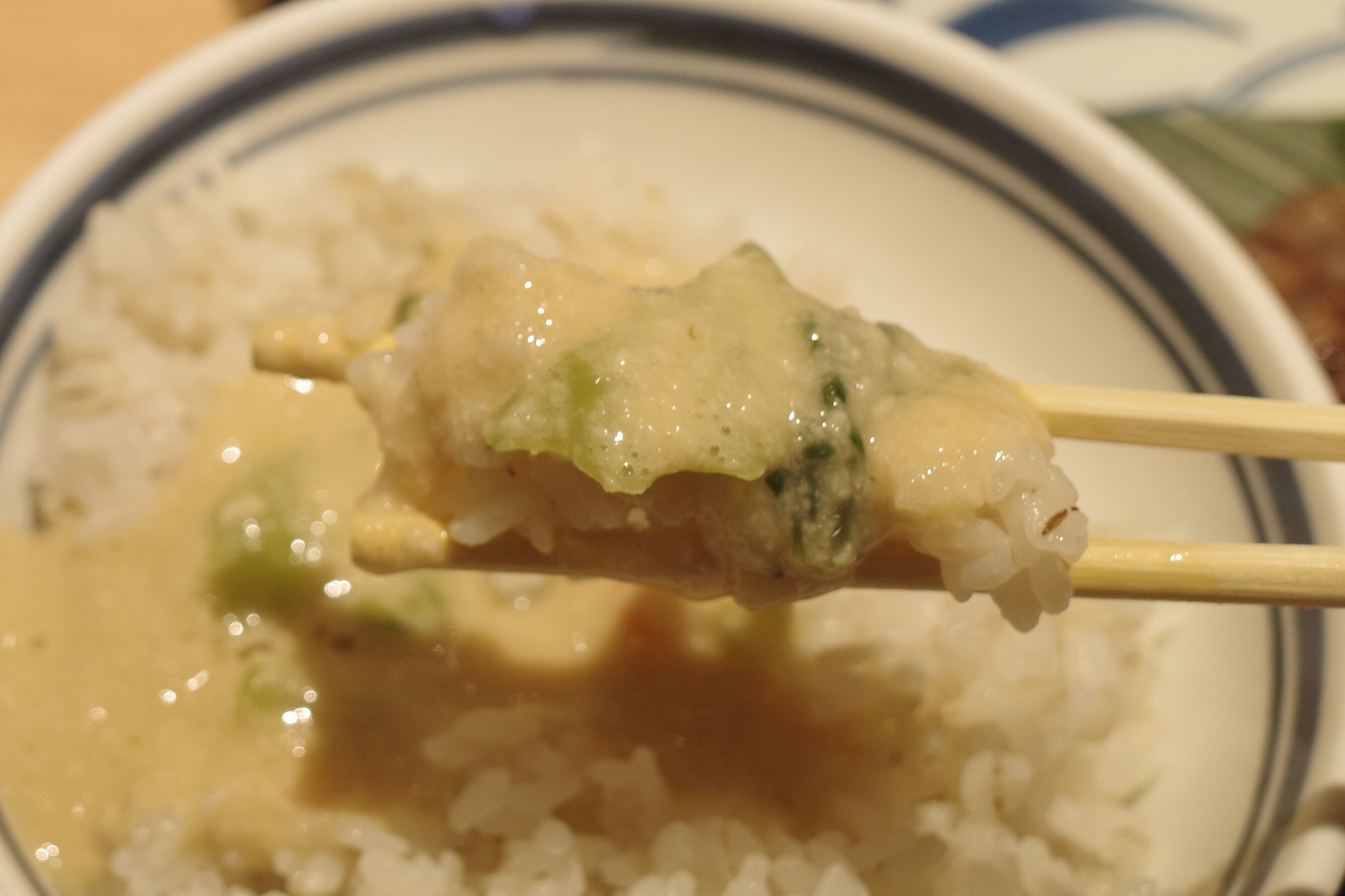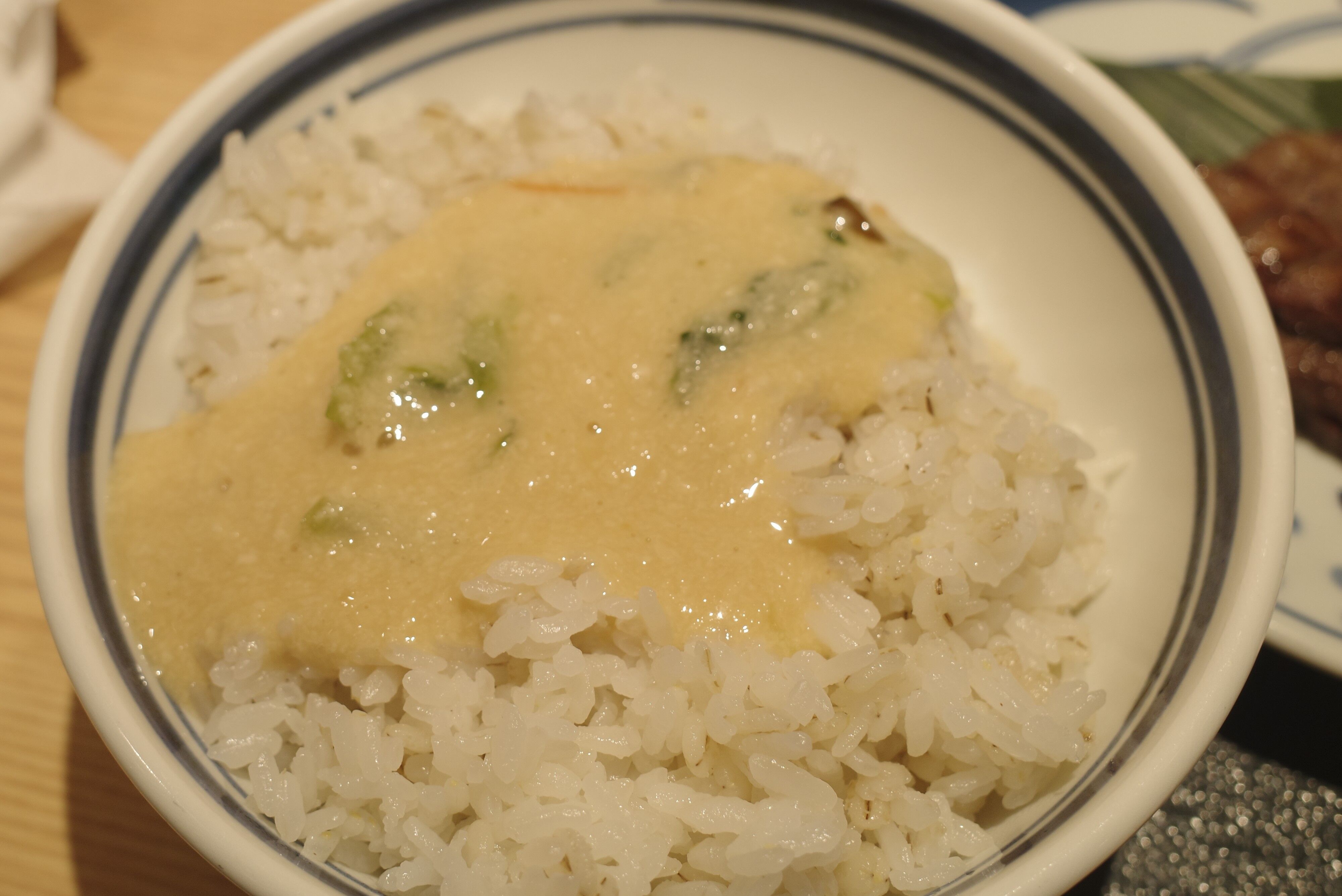 とろろを入れた麦飯はとろろの粘り気、塩気、海苔の香気があわさって堅実に美味しさレベルアップ!