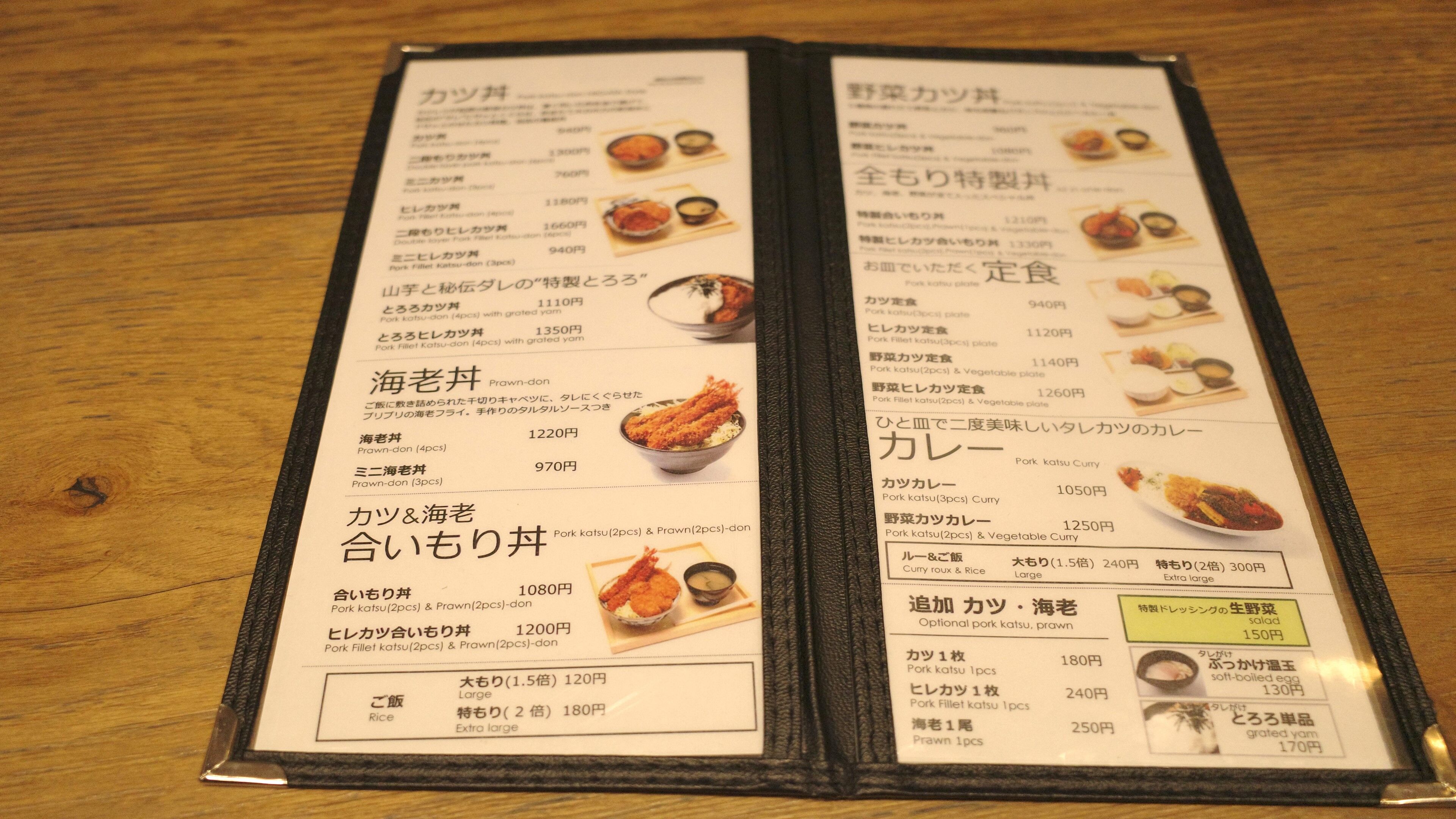 メニューはカツ丼、海老丼、合盛り丼、野菜かつ丼、全部盛り特製丼、カレー、トッピングメニュー。