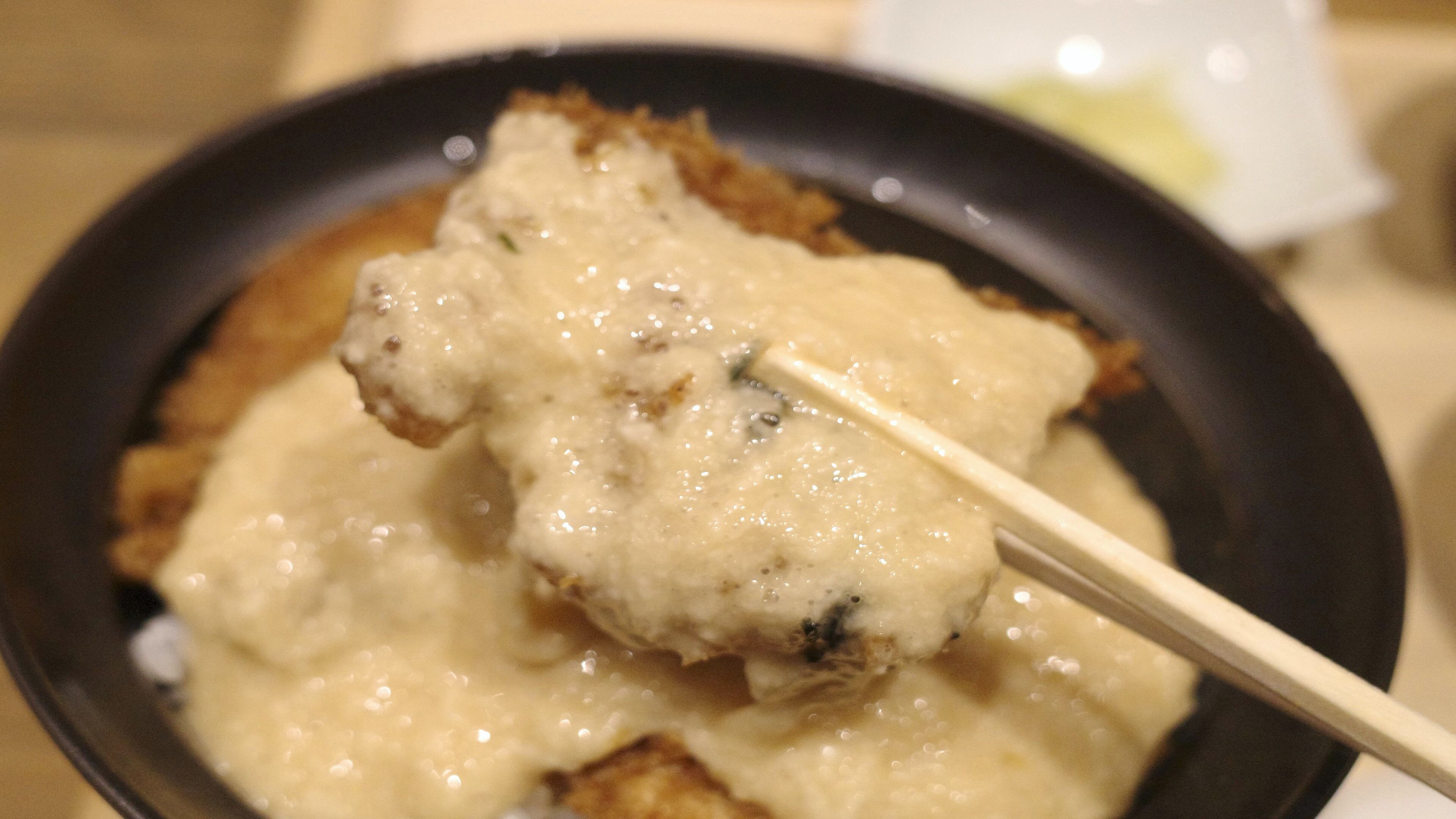 サクッとタレカツ丼を味わったら、このタイミングでとろろを投下!