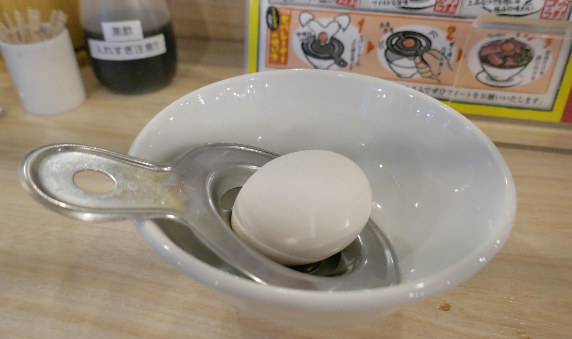 卵から黄身だけを掬う器具を添えて卵が着皿。