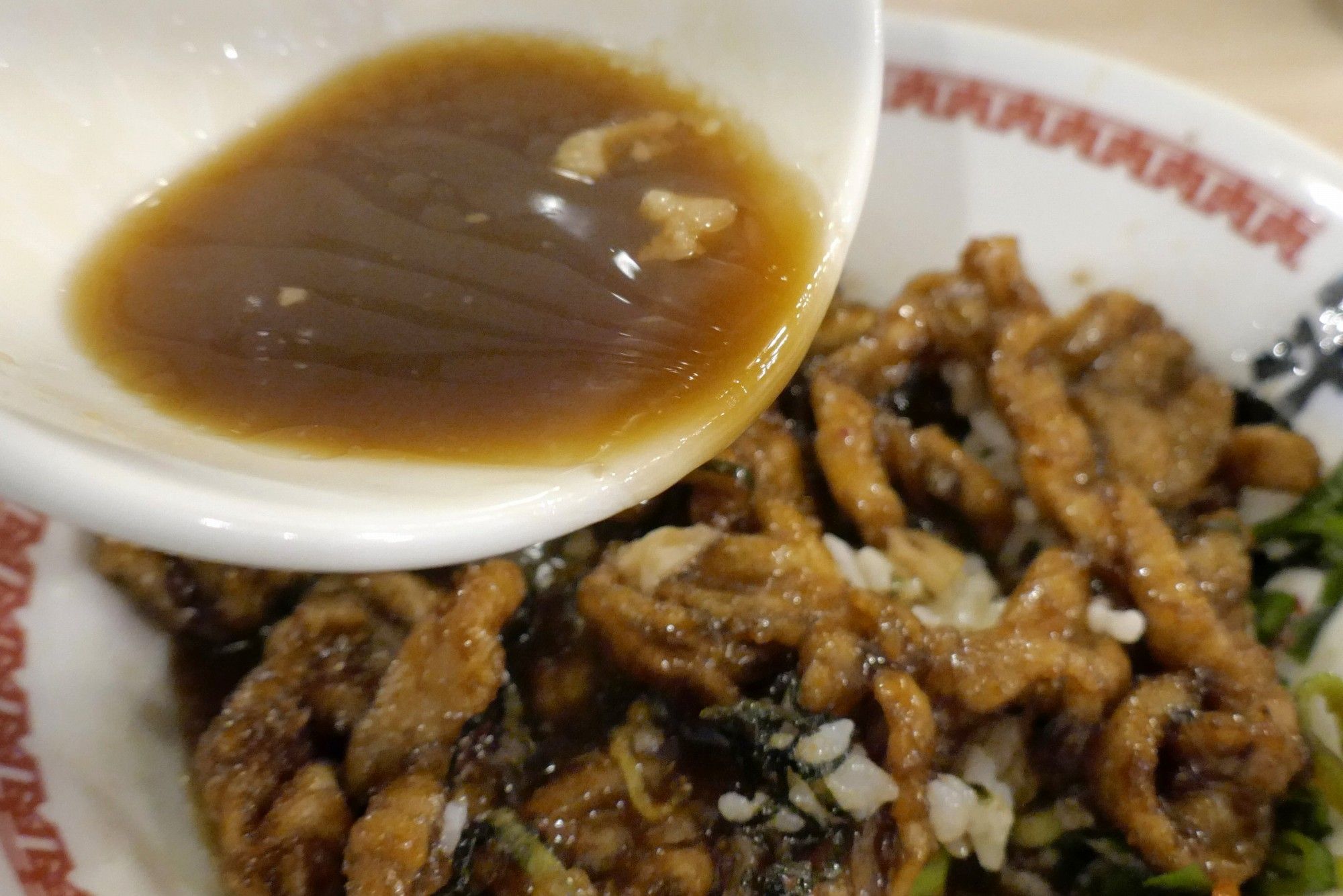 塩気がマイルドで旨味たっぷりなスープを加えることで、スルスルと流れるようにパワフルな「肉汁丼」を楽しむことが出来ました。