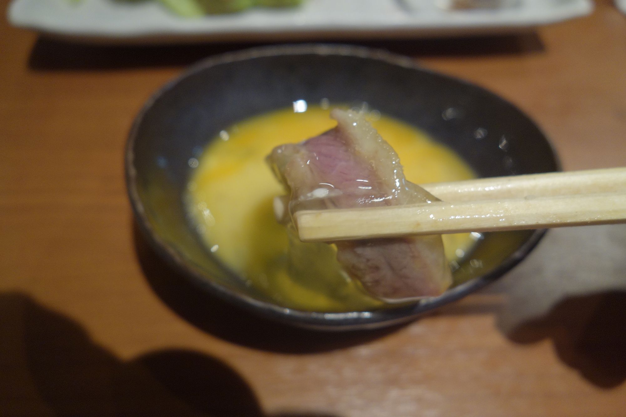 牛カツは素で食べるほか、ソースやXO醤のようなソースなどを絡めて食べても美味しく楽しめましたが、円やかな生卵に絡めて食べるのが一番美味しく楽しめました。