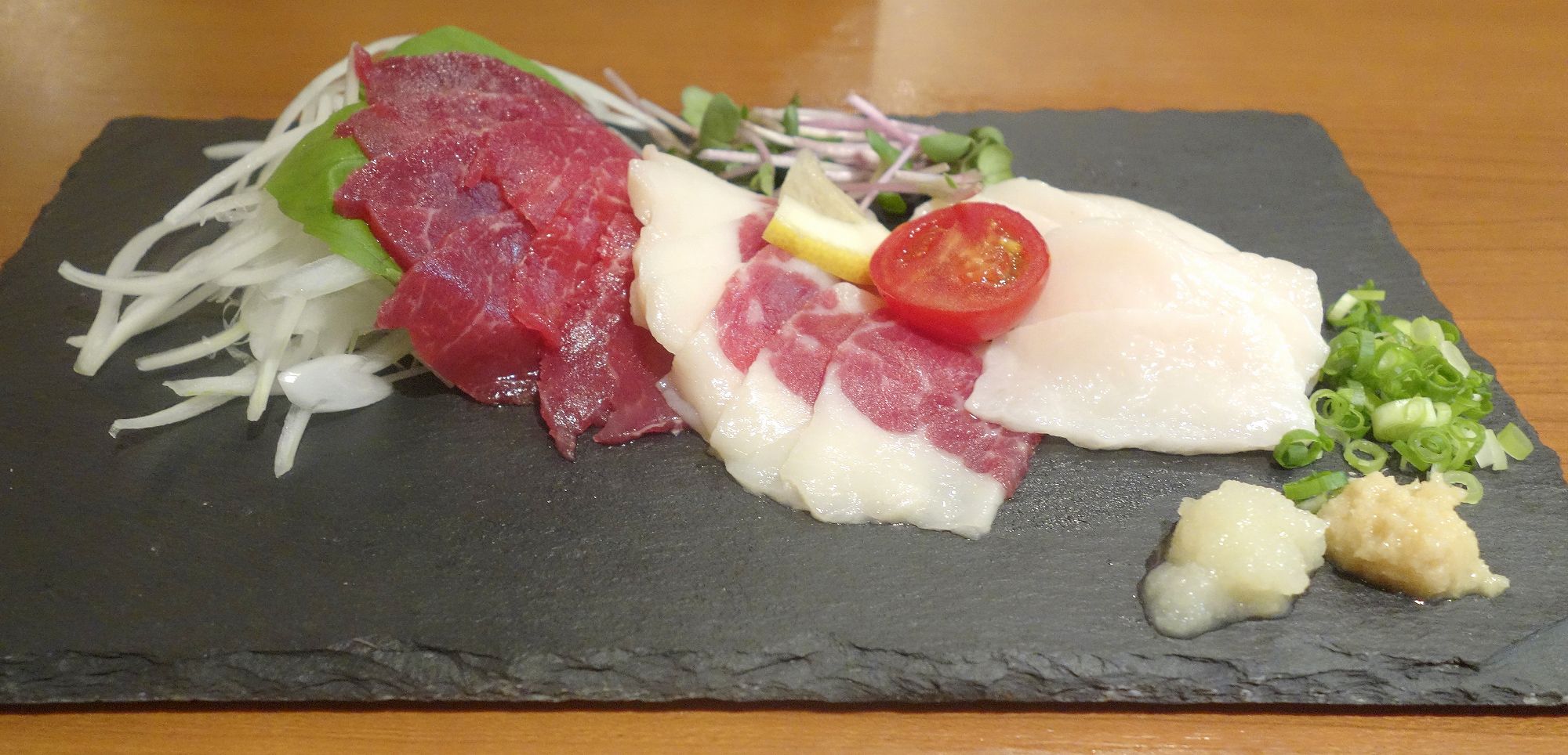 続いて馬刺し3種盛り合わせ1980円を注文。馬肉の産地である熊本県が被災したこともあって、価格は少々高めですが、脂の旨味が濃厚なコウネ、お肉と脂の旨味のバランスが良いふたえご、さっぱりながらも身の旨味がしっかり感じられる赤身共々全て美味しく楽しめました。
