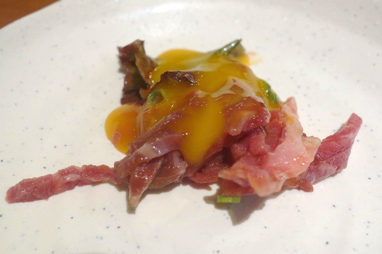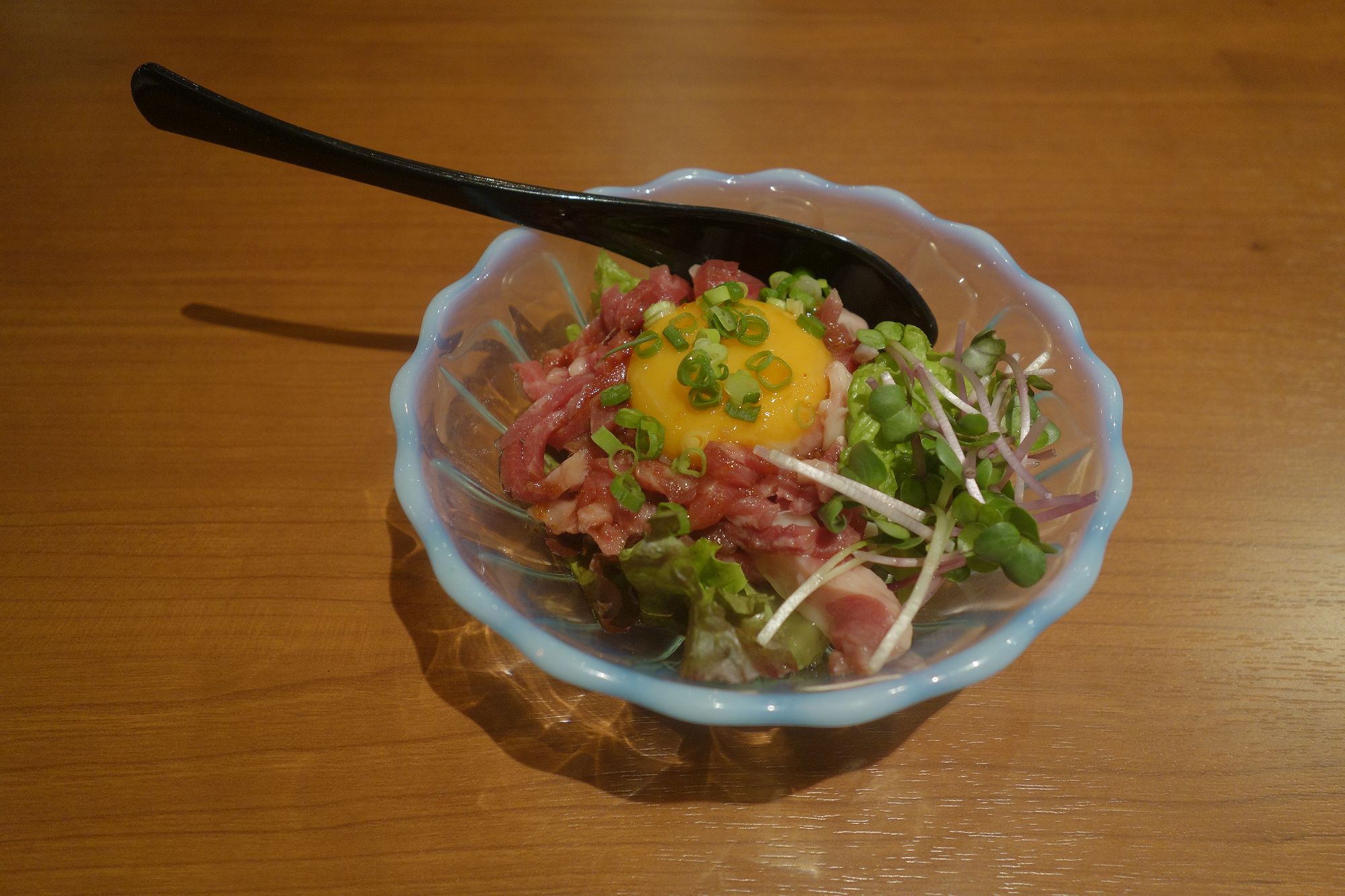 生肉ならではのフレッシュさが感じられる一品で、お肉自体はさっぱりとした味わいで、卵黄を絡めて食べることでコクのある美味しさが楽しめます。