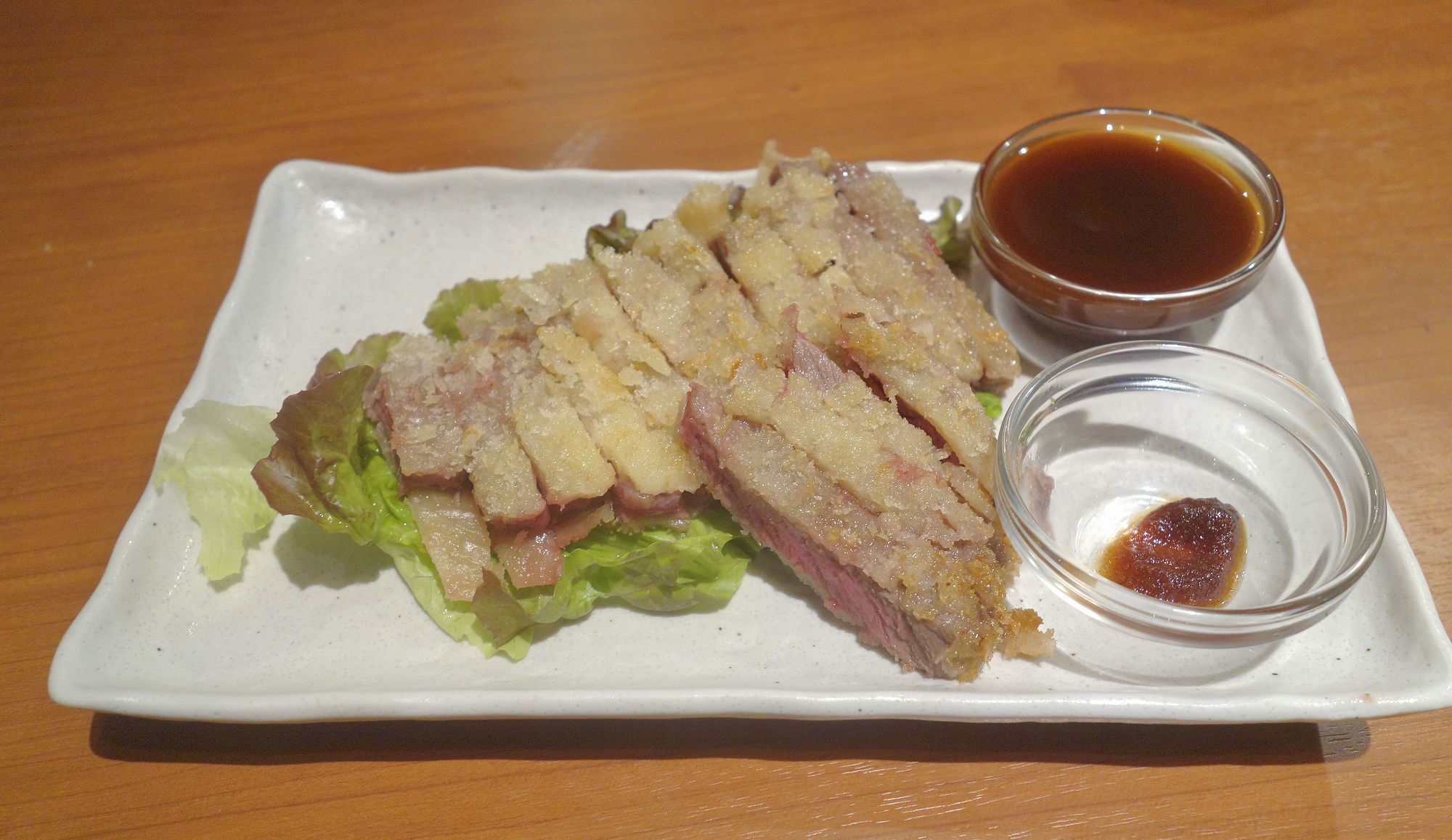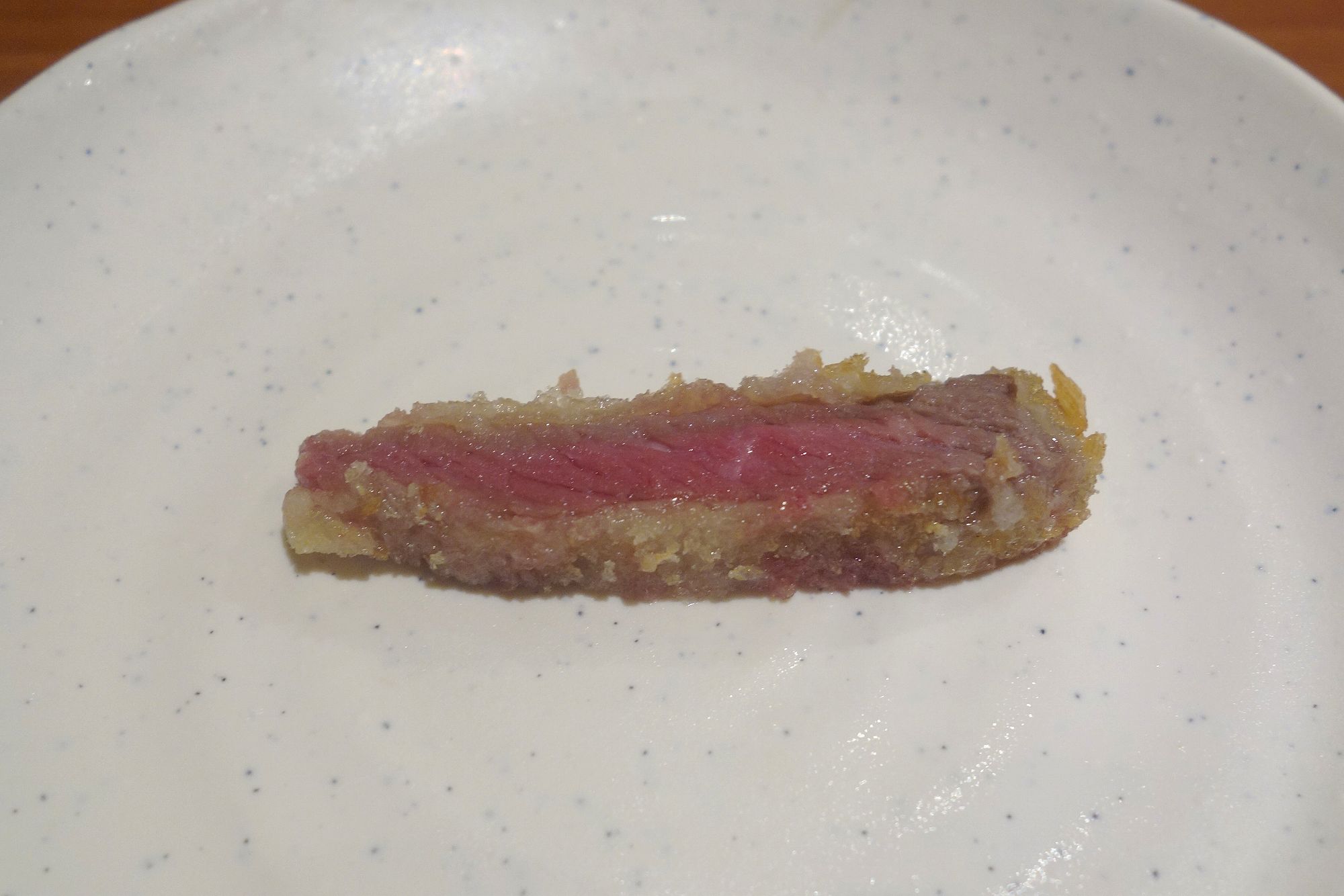 最後は牛レアかつ980円を注文。衣は白く低温で揚げているのが特徴です。