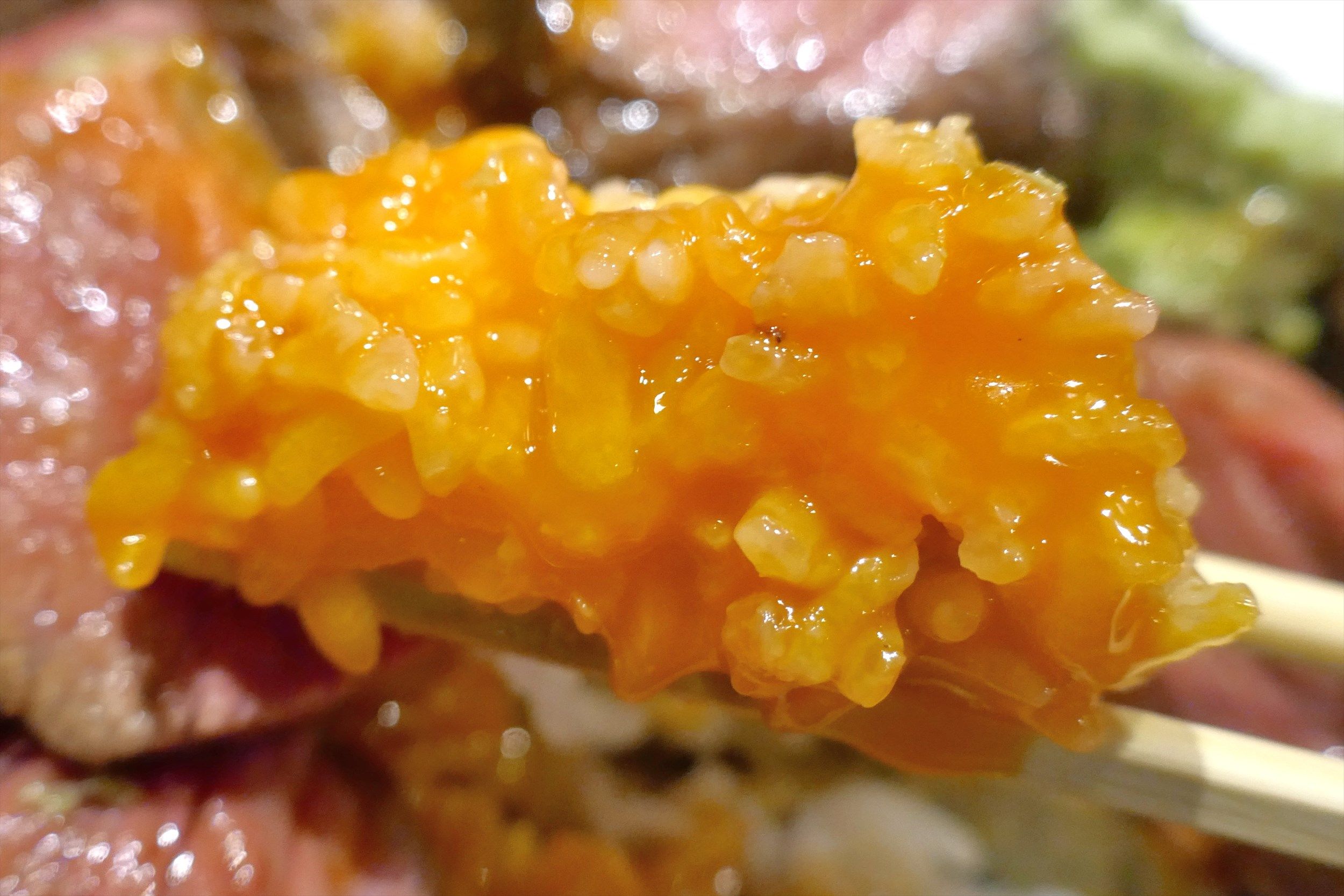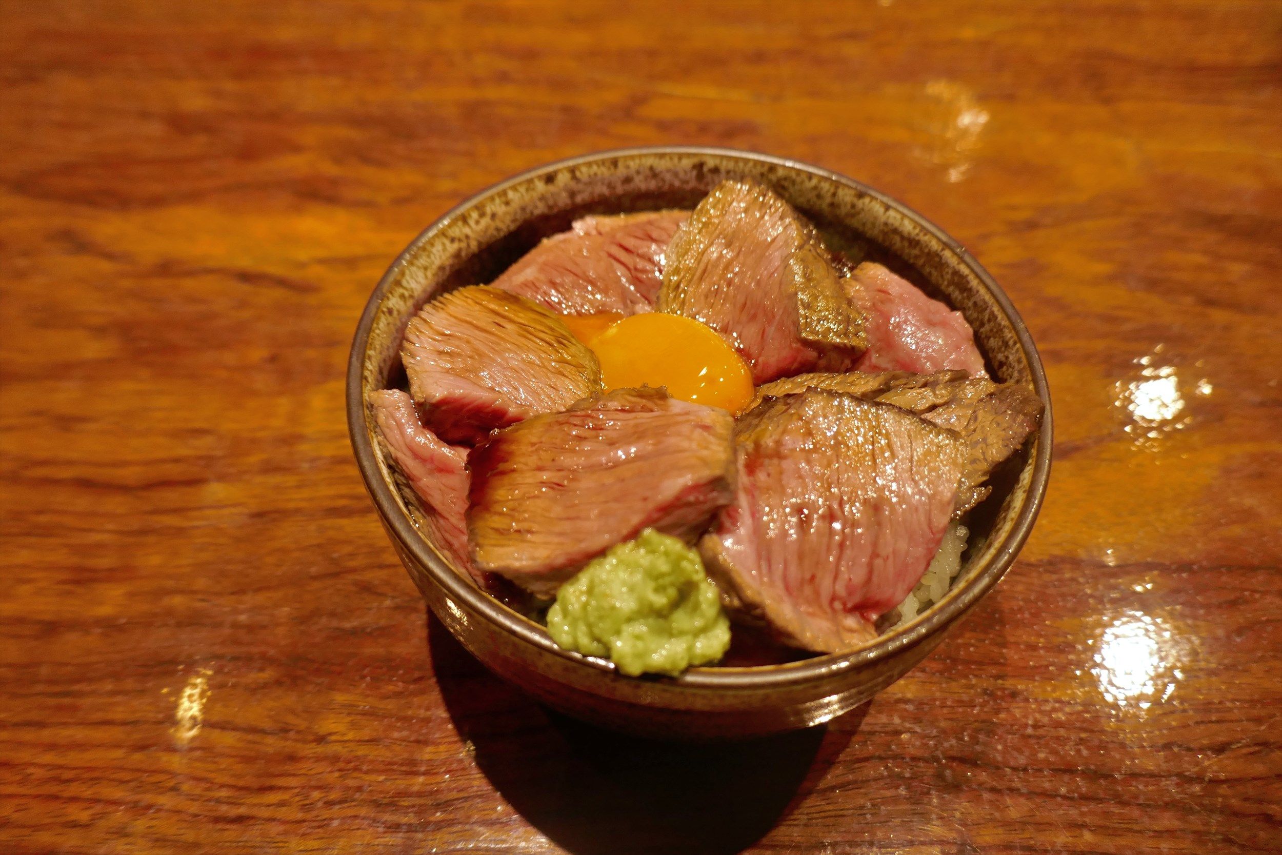 黄身を少々つけて程よくお肉のパワフルな美味しさと、黄身のコクをバランス良く楽しむのも乙なもの。