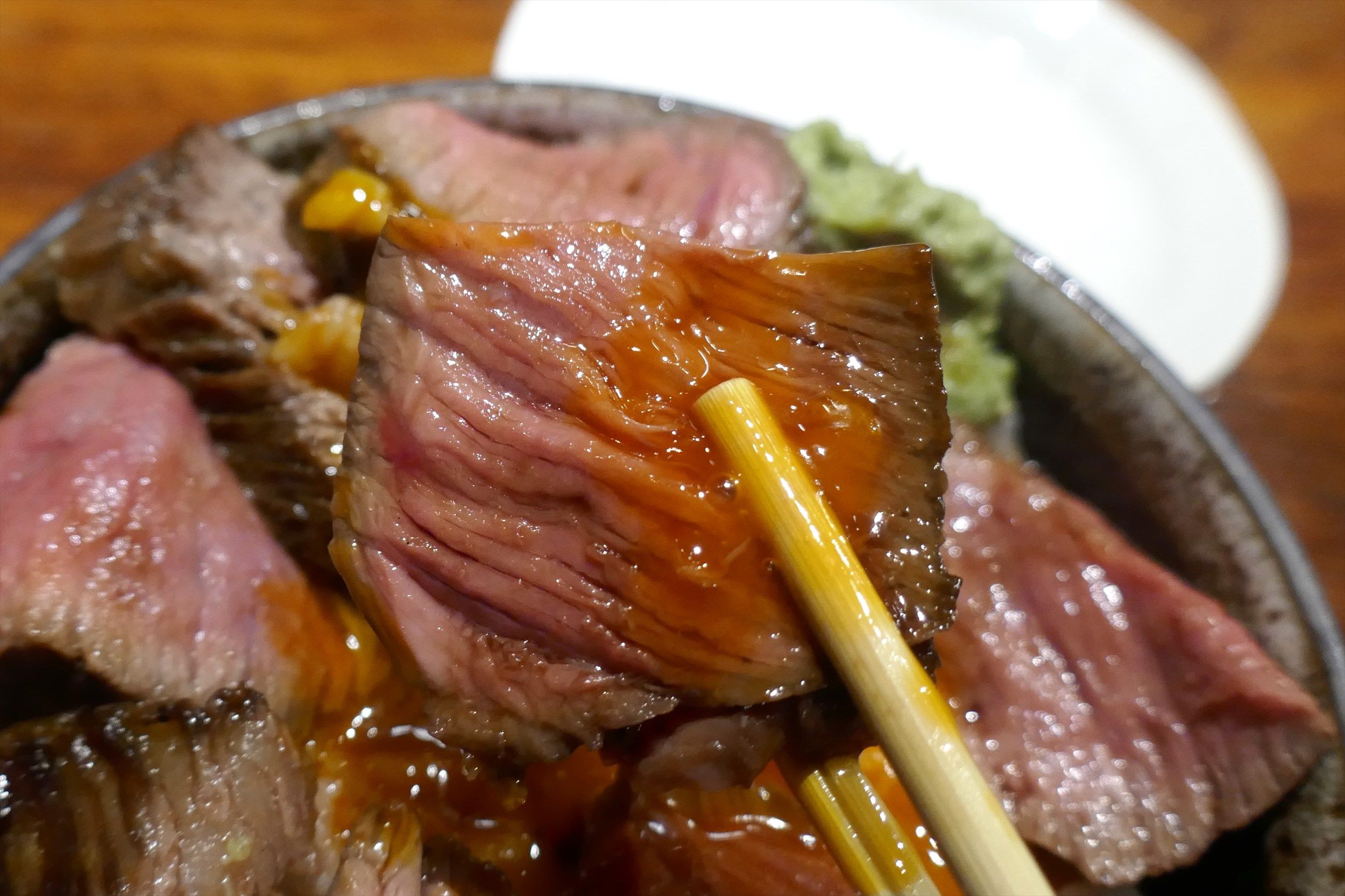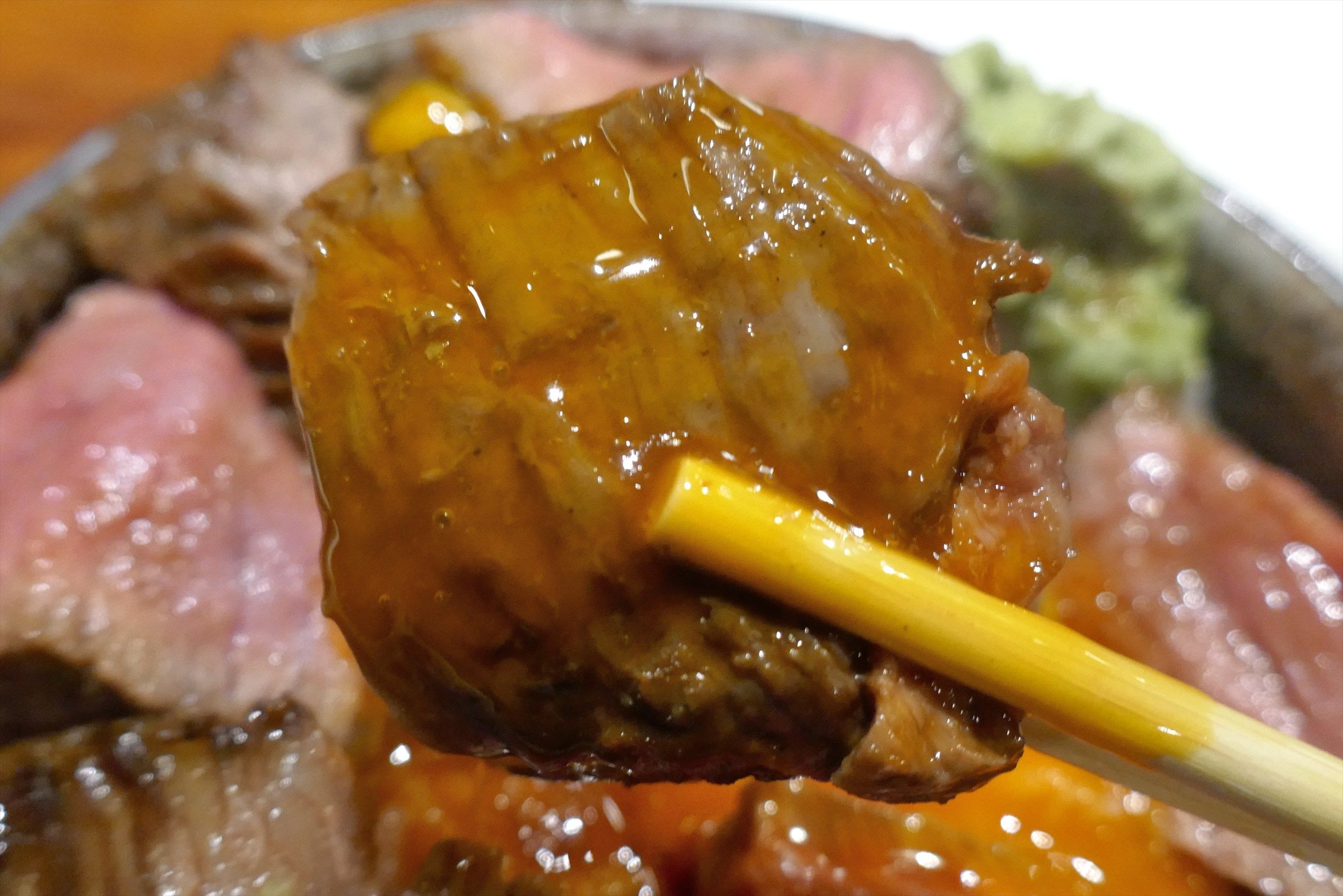 ほどなくしてまかない丼な「ローストビーフ丼」が完成!他店で食べたローストビーフ丼とは分厚さがまるで異なる大迫力な一品でした。