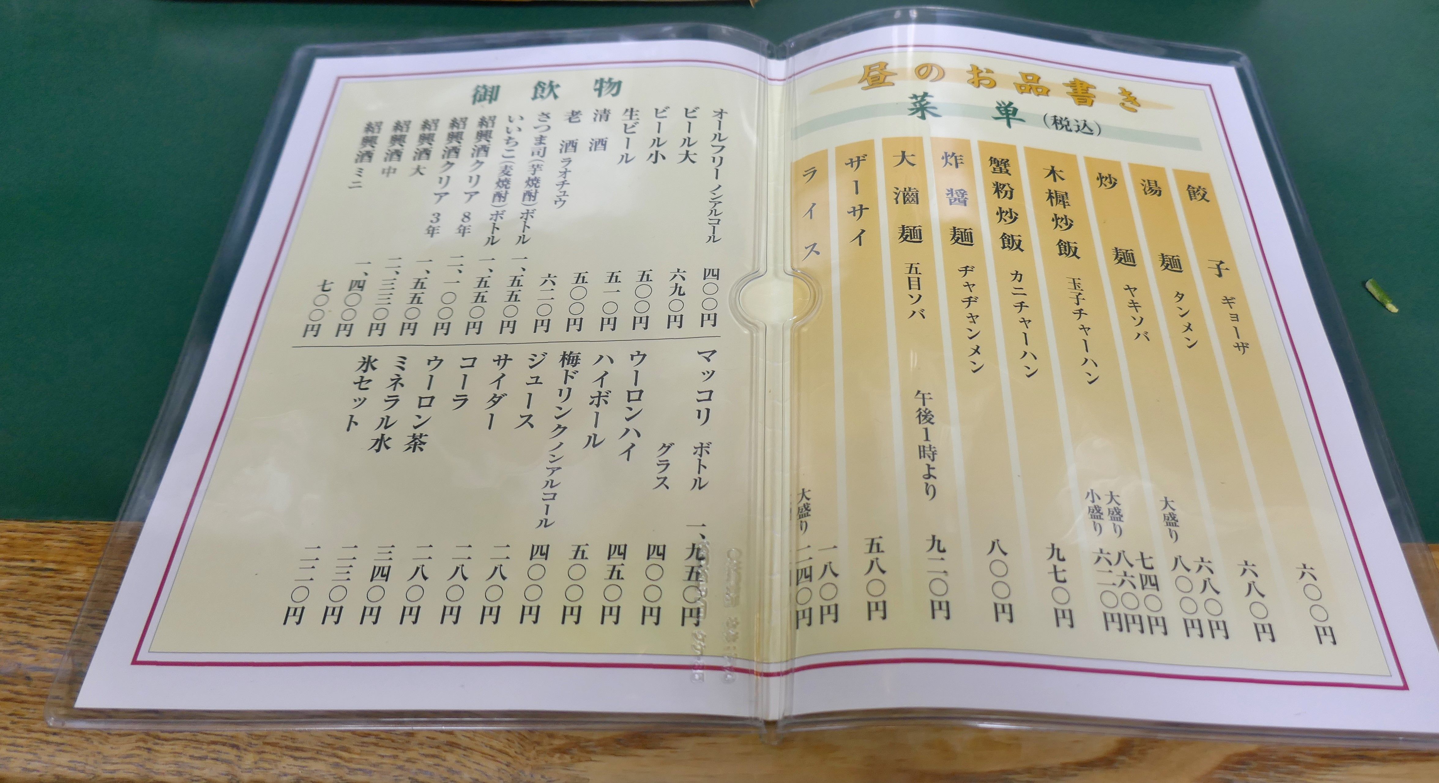メニューは餃子、タンメン、焼きそば、チャーハン、ジャジャン麺、五目そば、各種ドリンクとランチタイムは大変シンプルです。