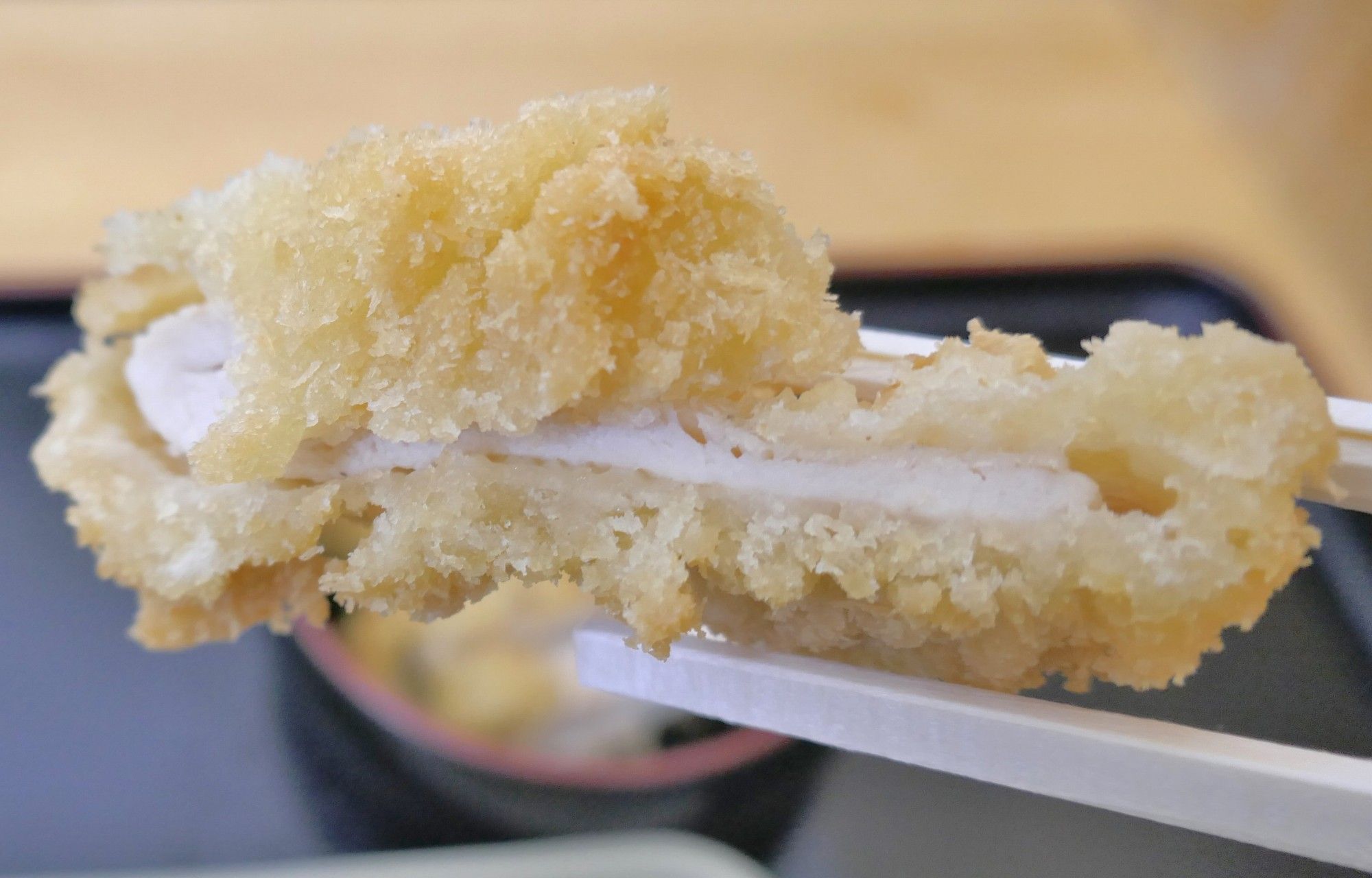 そばを待つ間、先に受け取った「とりかつ」80円から食べてみることに。
