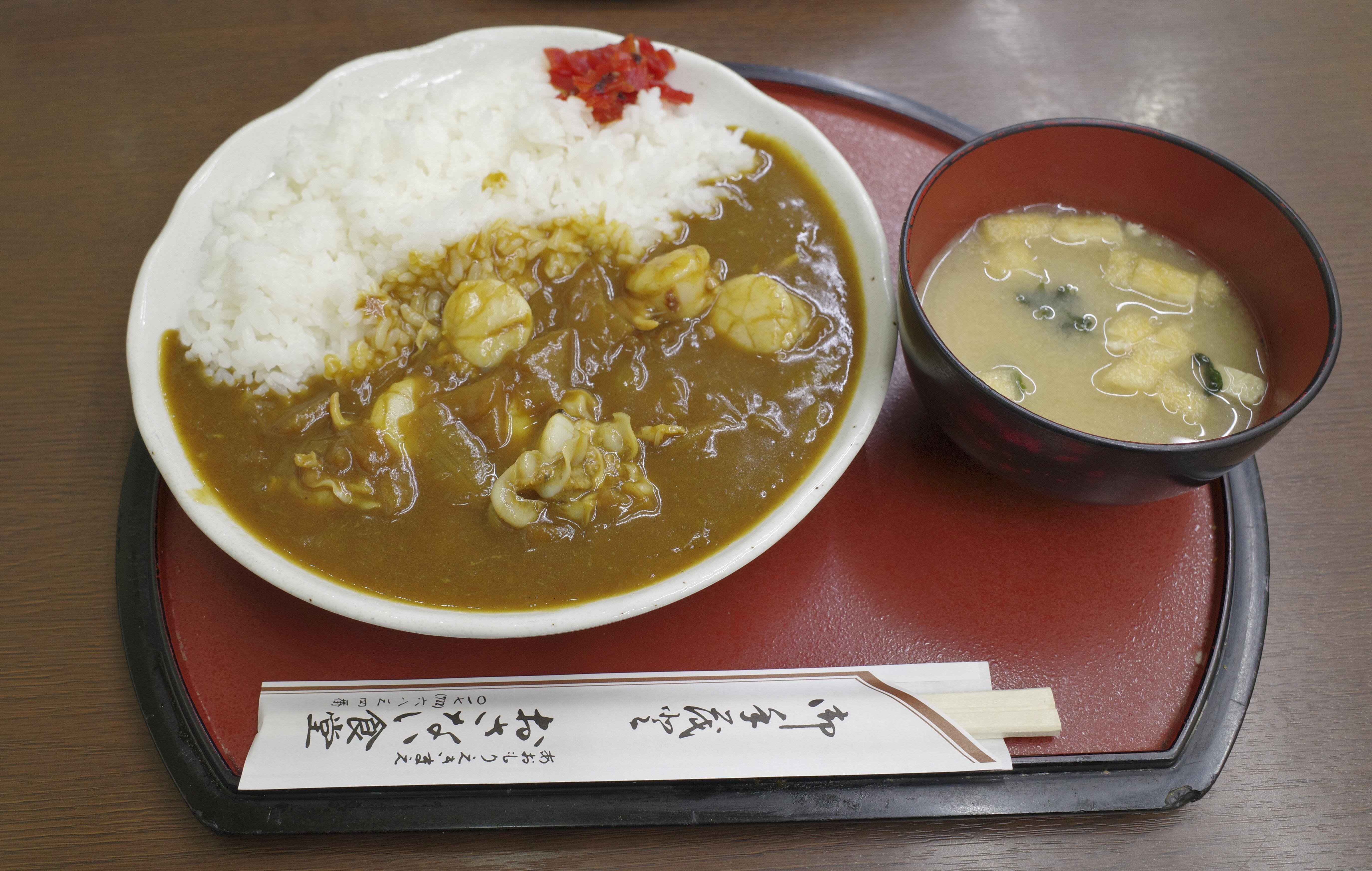 みそ汁がついた「ホタテカレー」は、注文してから10分弱ほどで目の前に登場しました!