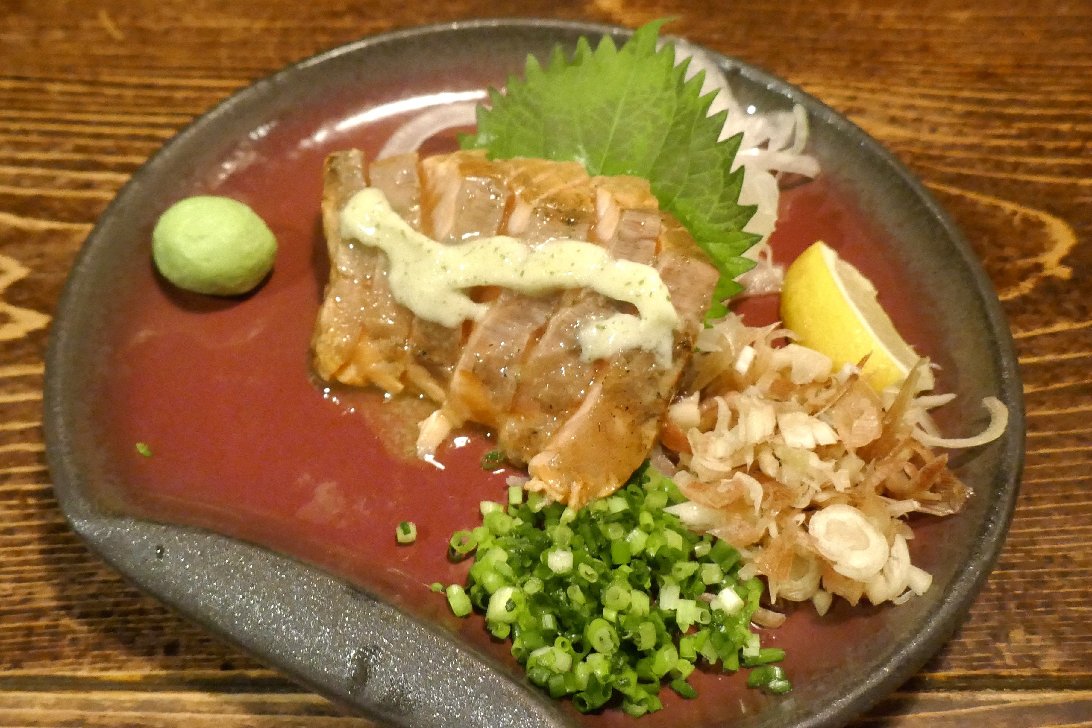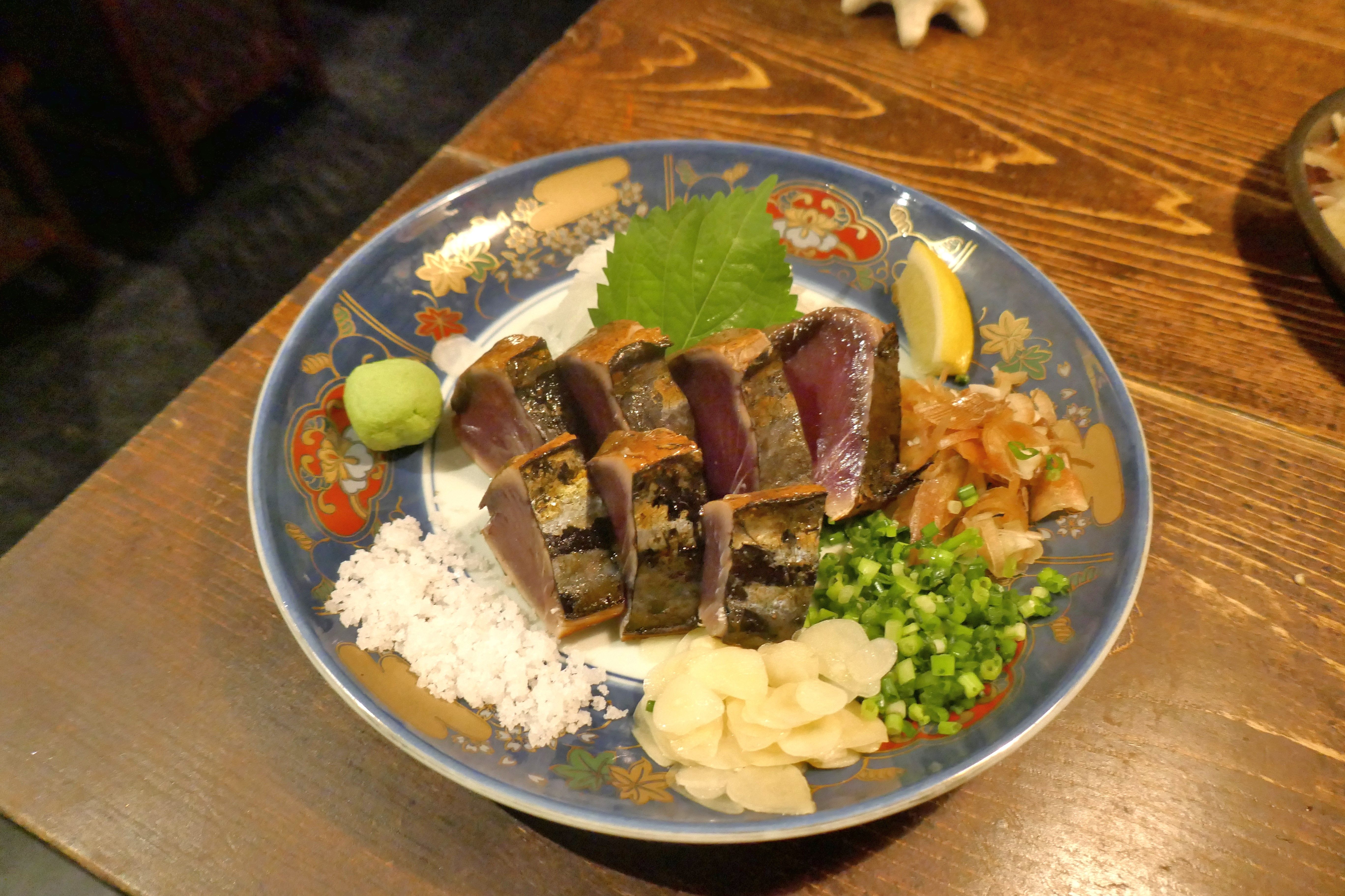 「いぶし かつをの塩タタキ 」1480円は、分厚く食べごたえも最高!身からは燻した風味と、戻りかつお風に脂が乗ってウマー!