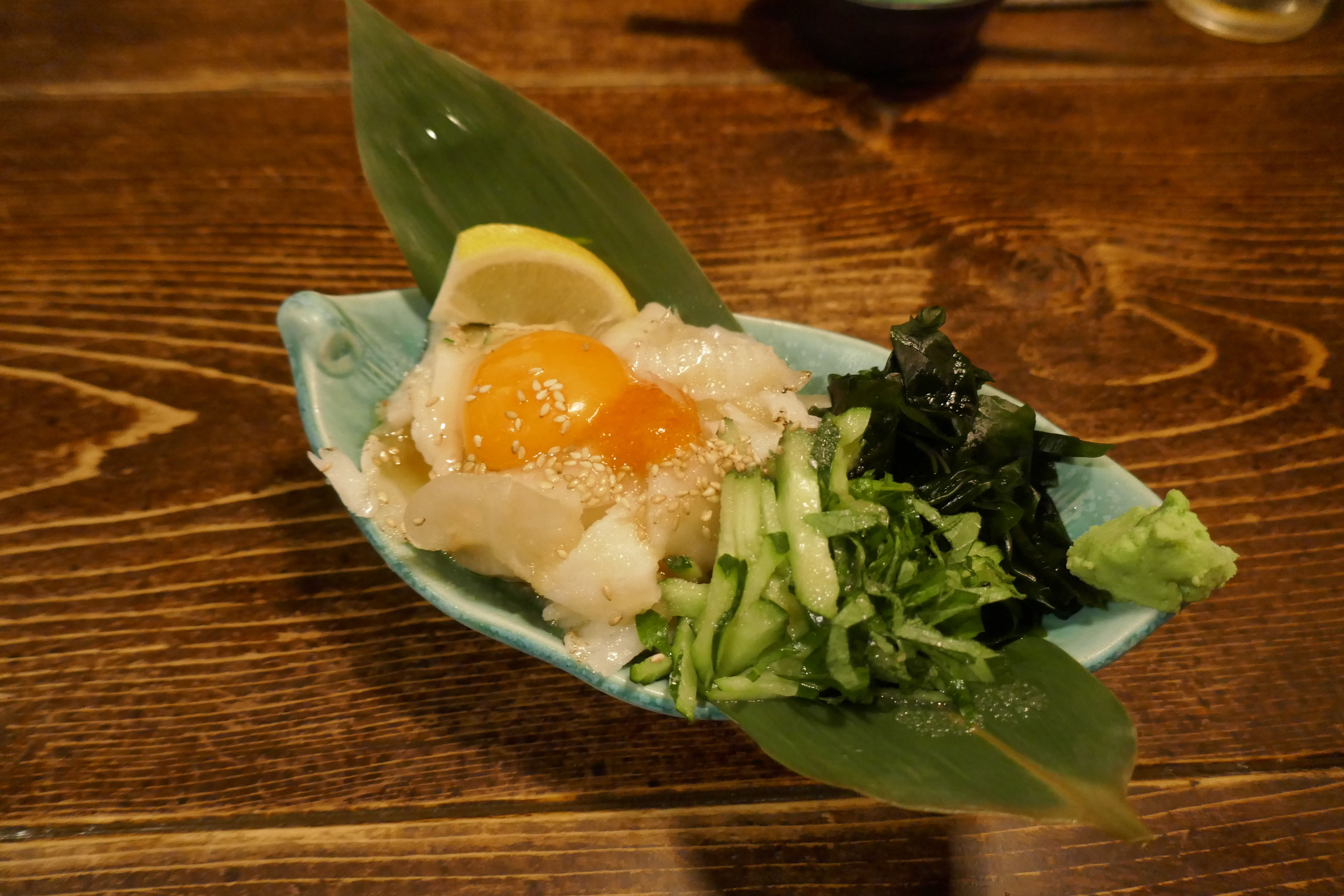 まずは、「炙りエンガワの塩ユッケ」780円をオーダー。オイリーなエンガワに野菜や黄身の風味が絡んでさっぱりと旨味濃いしでお酒がススムウマさ!