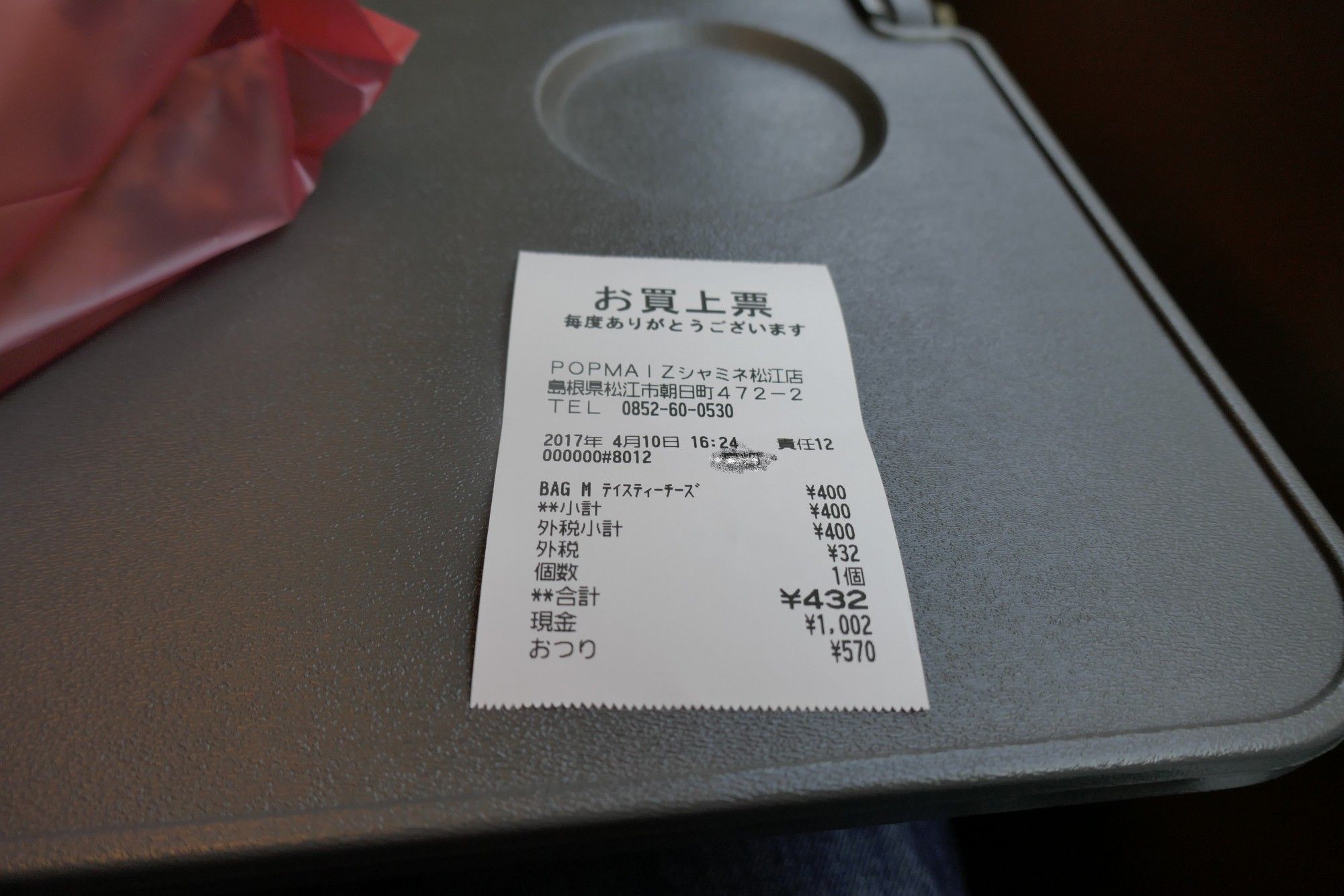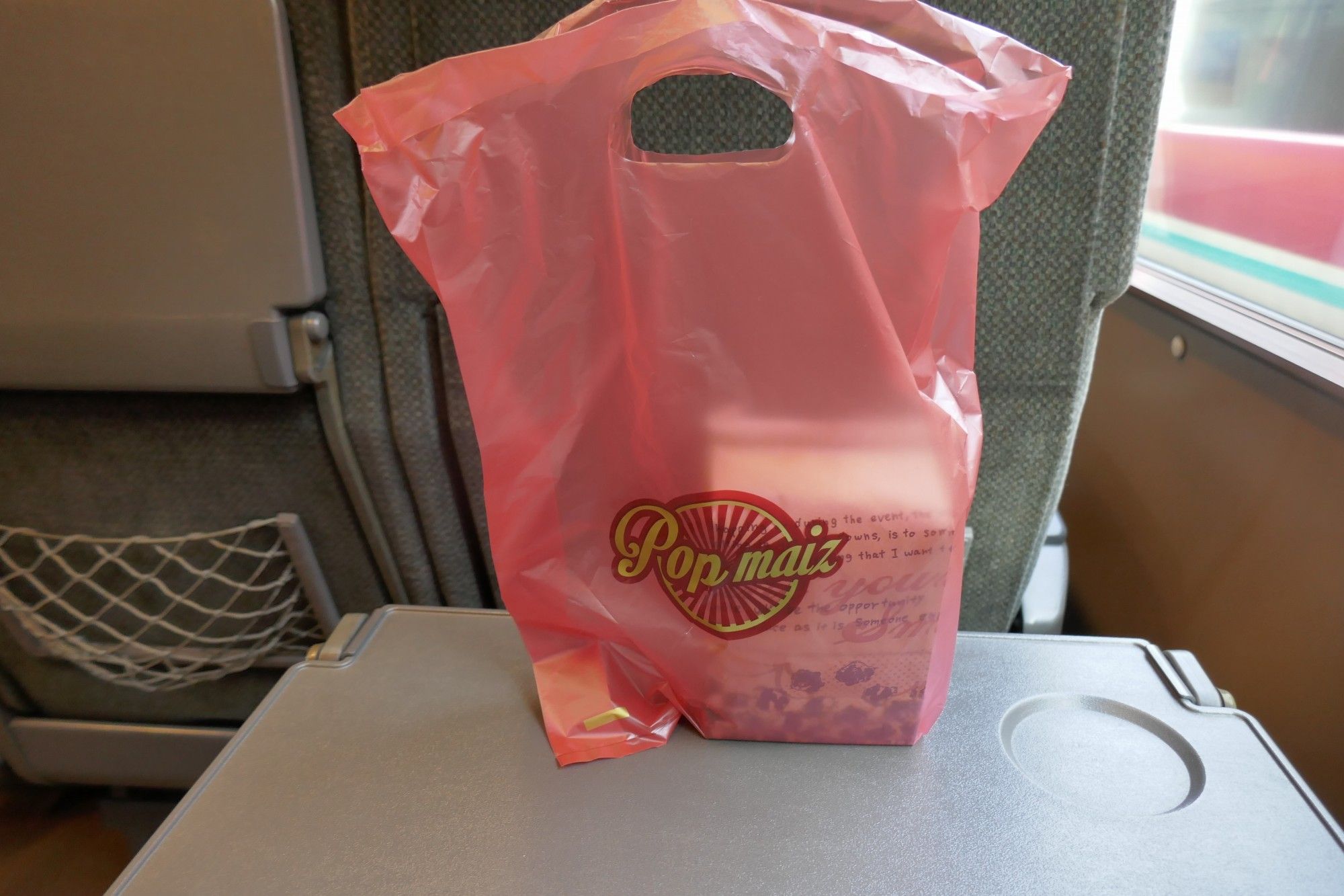 山陰本線上を爆走中にポップマイズの袋を激写。