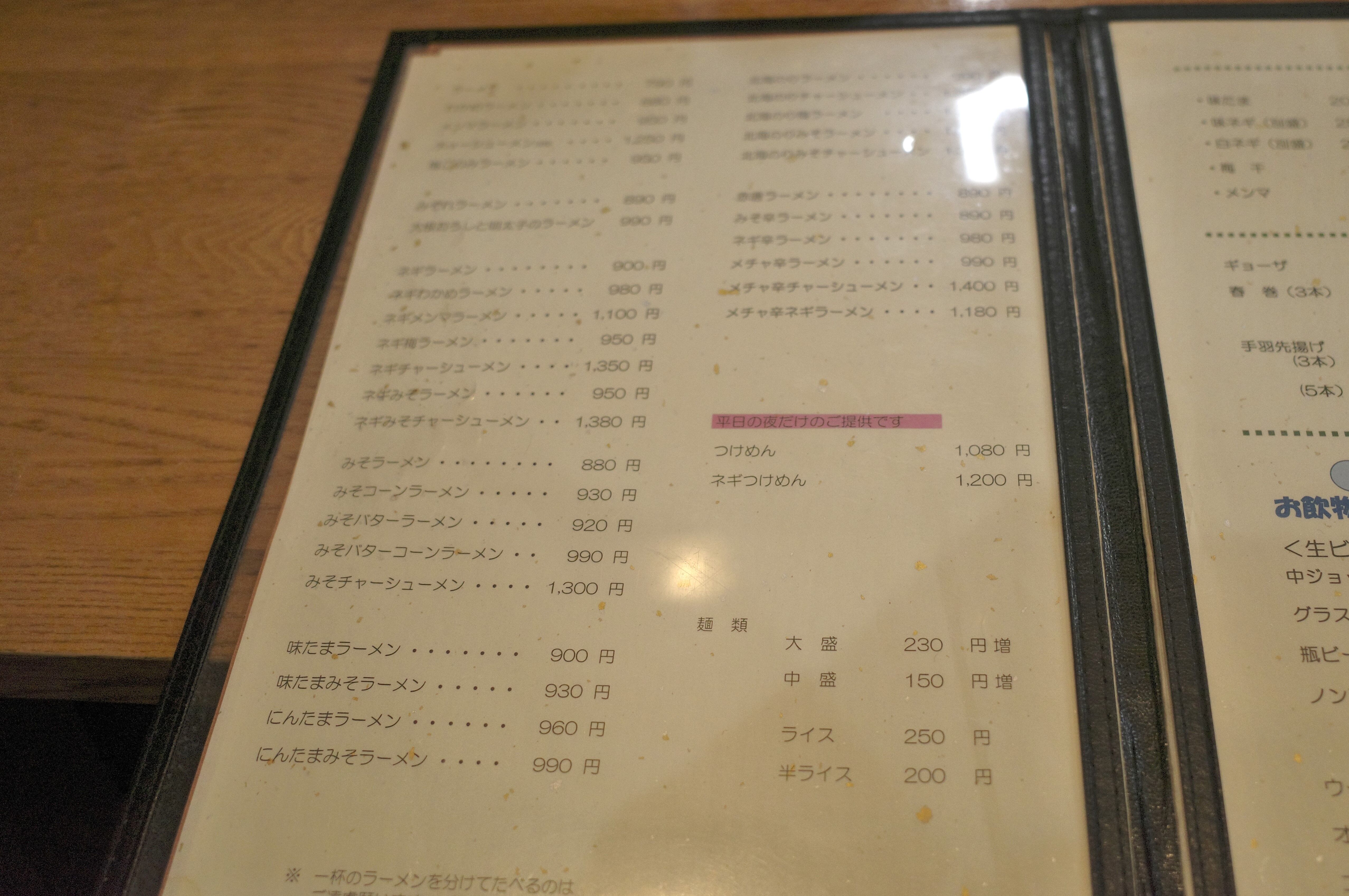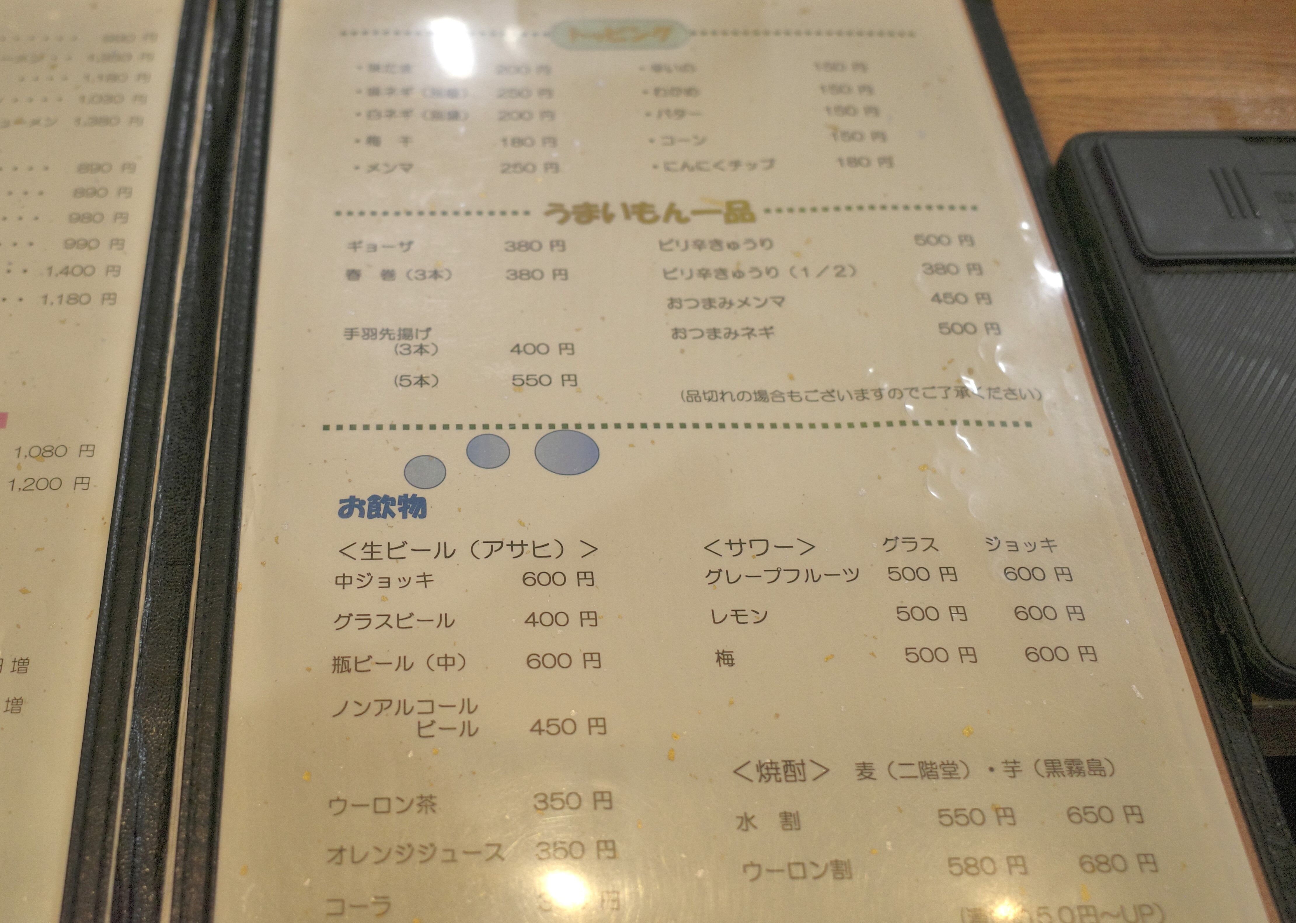 ラーメン用のトッピングメニュー、餃子などの一品メニュー、各種ドリンクメニューも用意されていました。