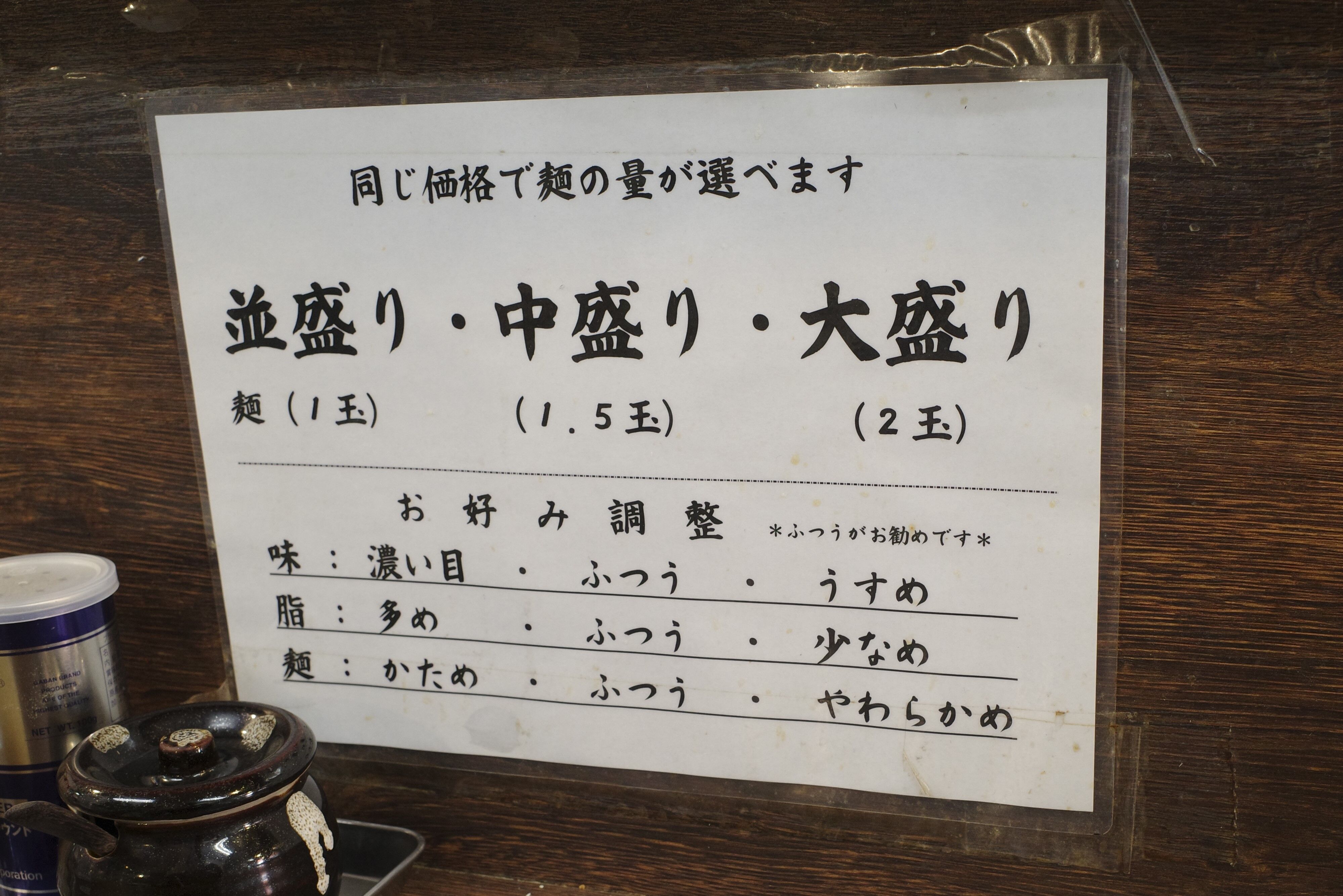 麺の量は中盛り、味薄め以外は全て普通をチョイスしました。