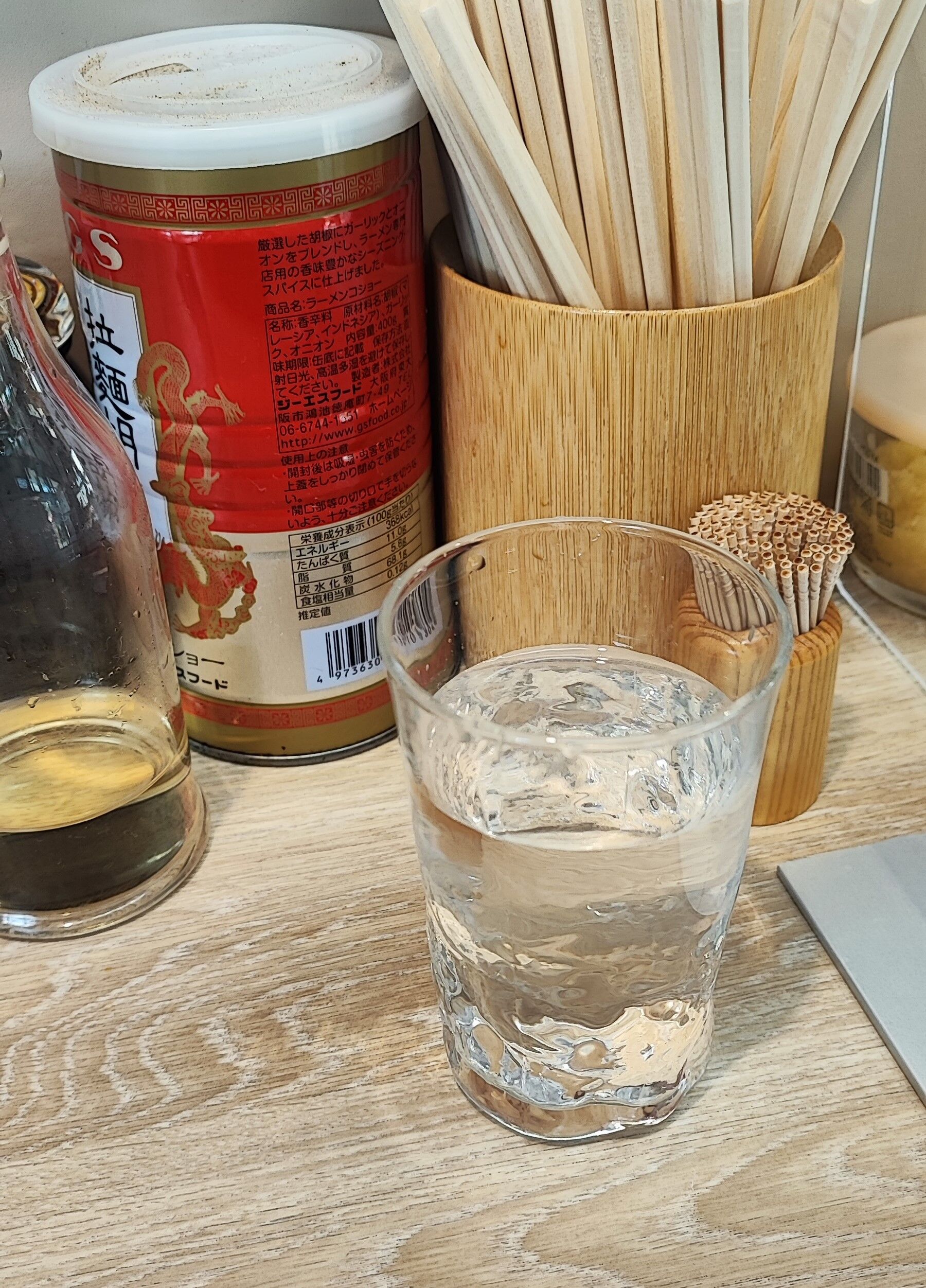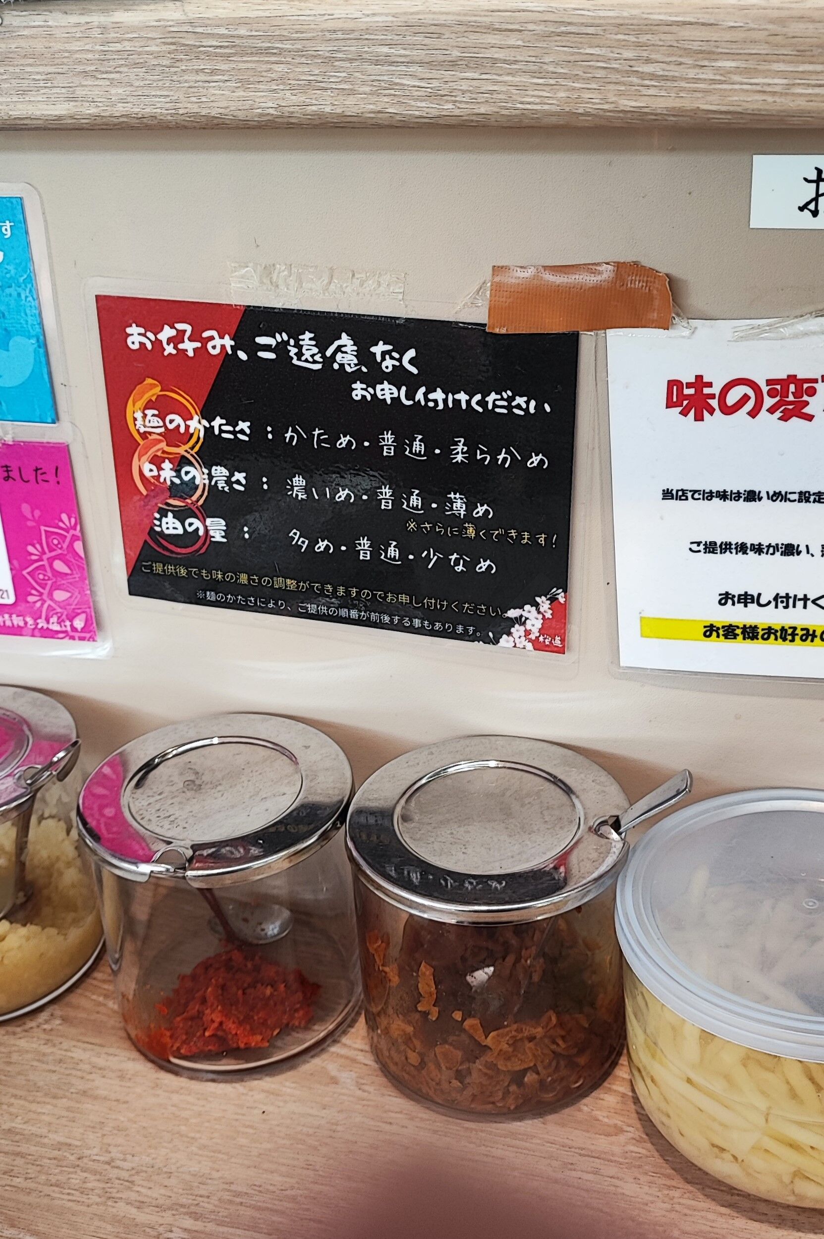 ラーメンが出来上がるまでの間、卓上に置かれた調味料を見つつ・・・