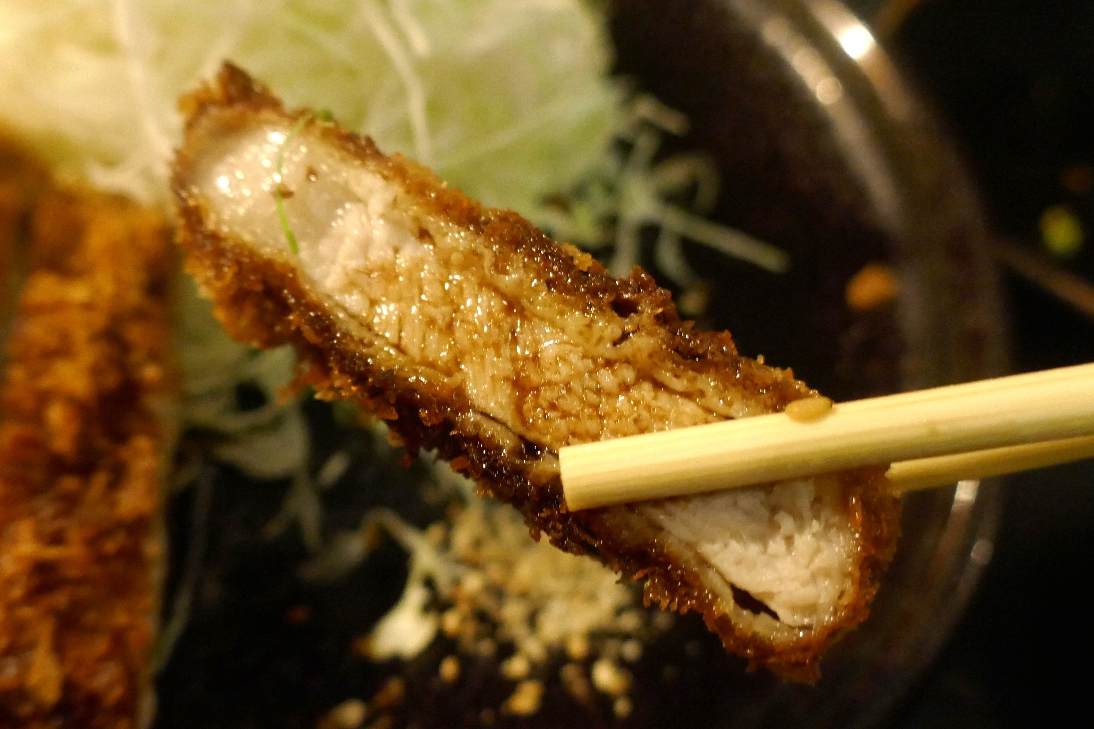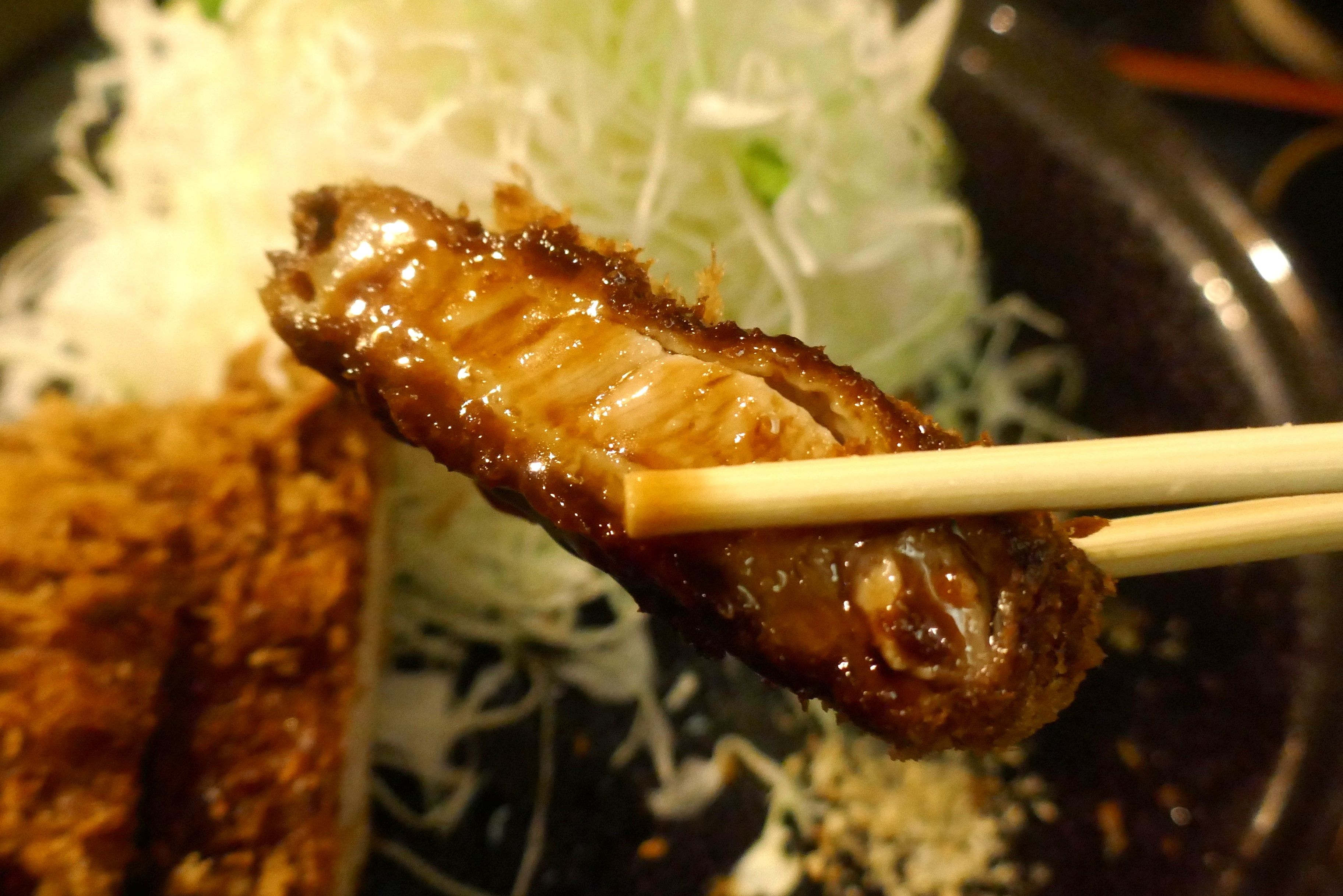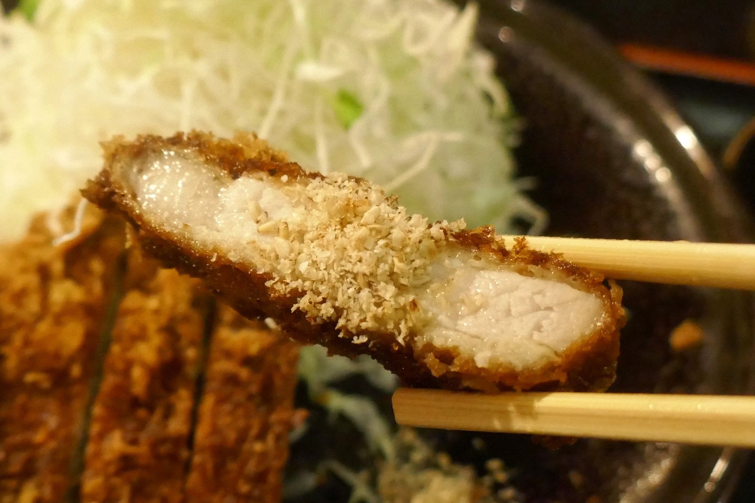 まずは何もつけずにとんかつを楽しんでみると、あら目な衣にジューシーで後味軽やかなもち豚の風味が絡んで後味キリリ!