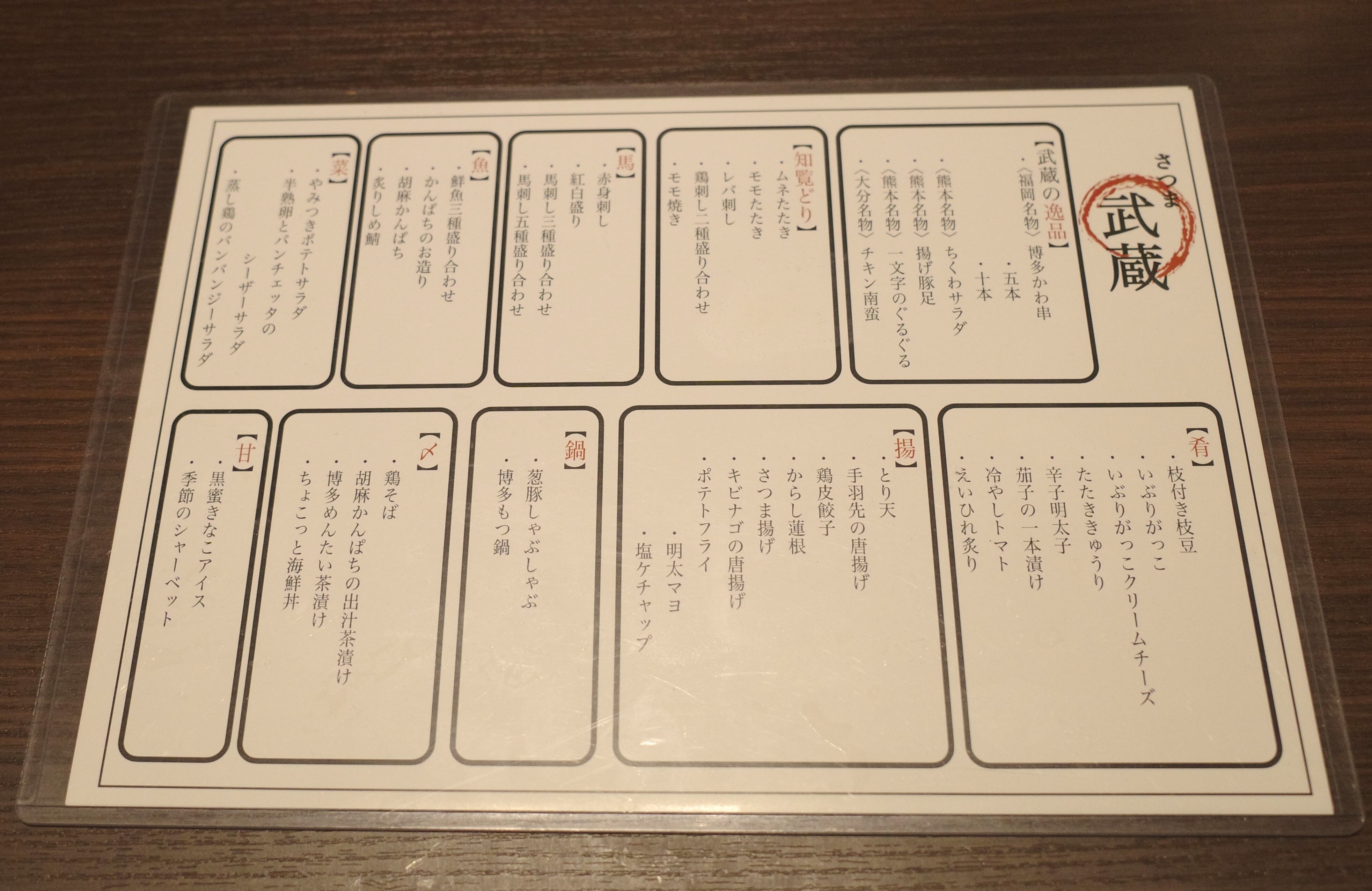 一品料理、知覧鶏、馬料理、魚料理、サラダ、酒の肴、揚げ物、鍋、ご飯物、スイーツで以上です。