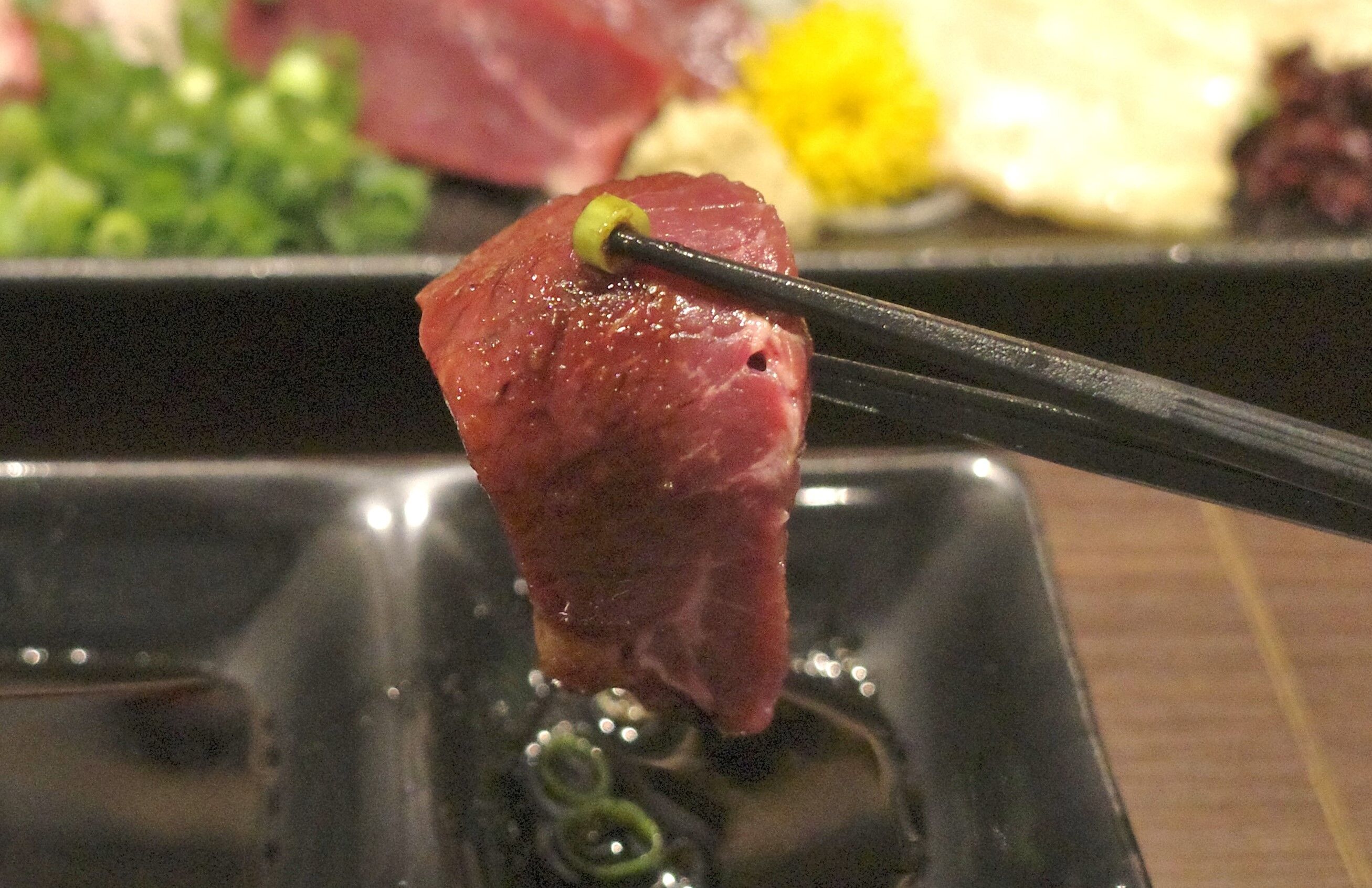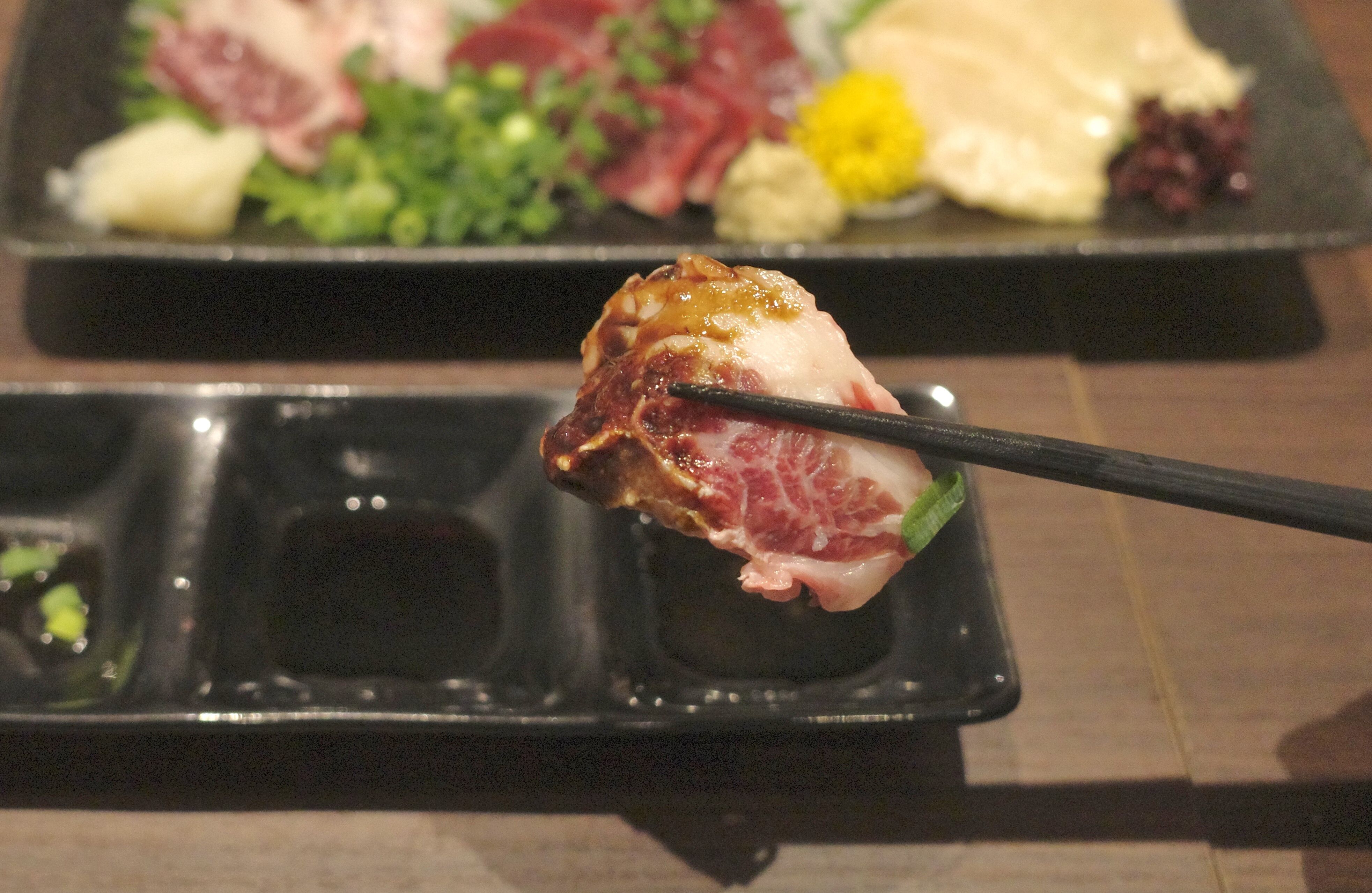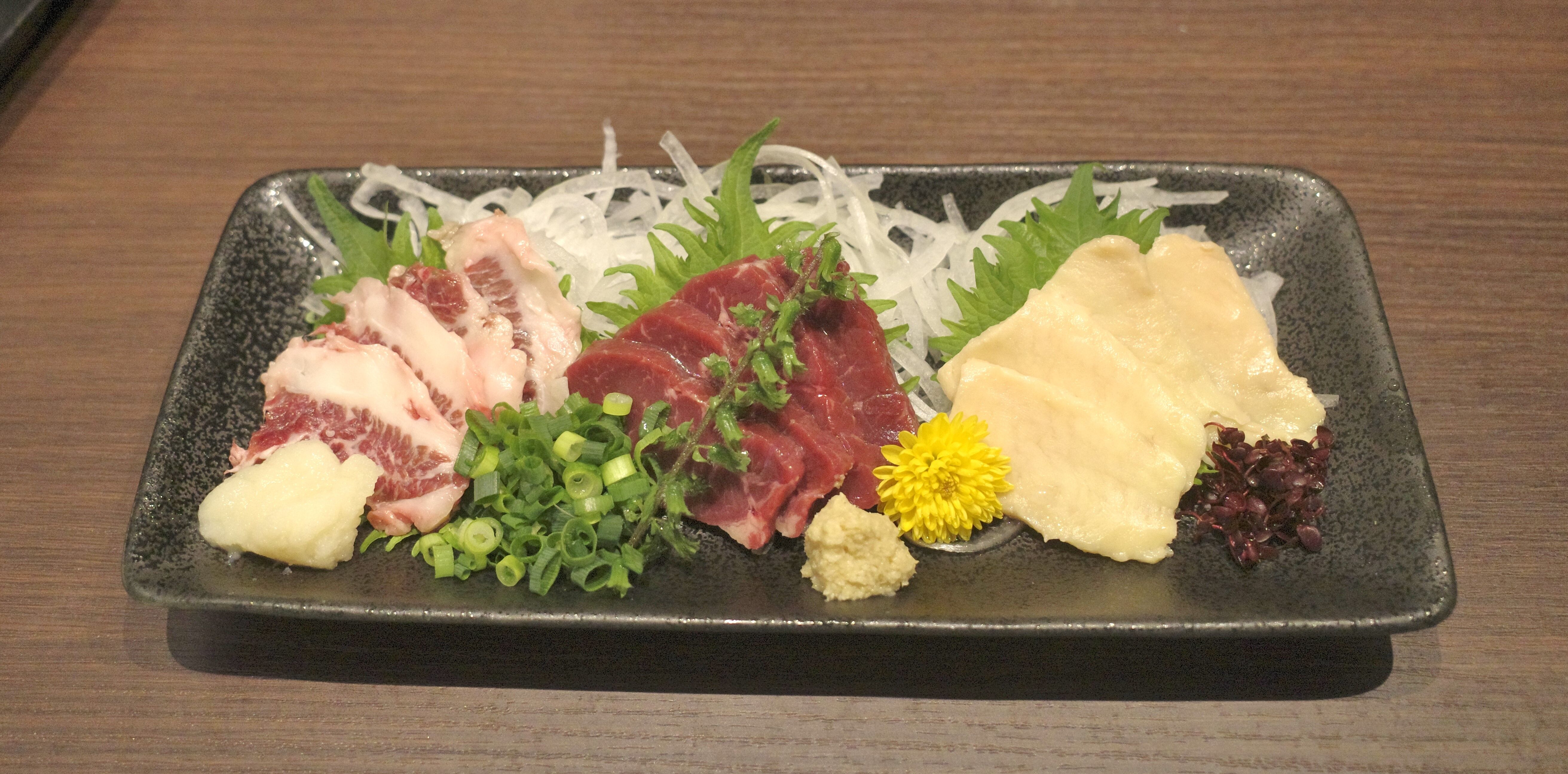 さらに勝ち馬に乗れるように願を掛けたい気持ちもあって注文した「馬刺しの三点盛り(ふたえご、赤身、こうね)」1932円は、どれもつややかなビジュアルが好印象!