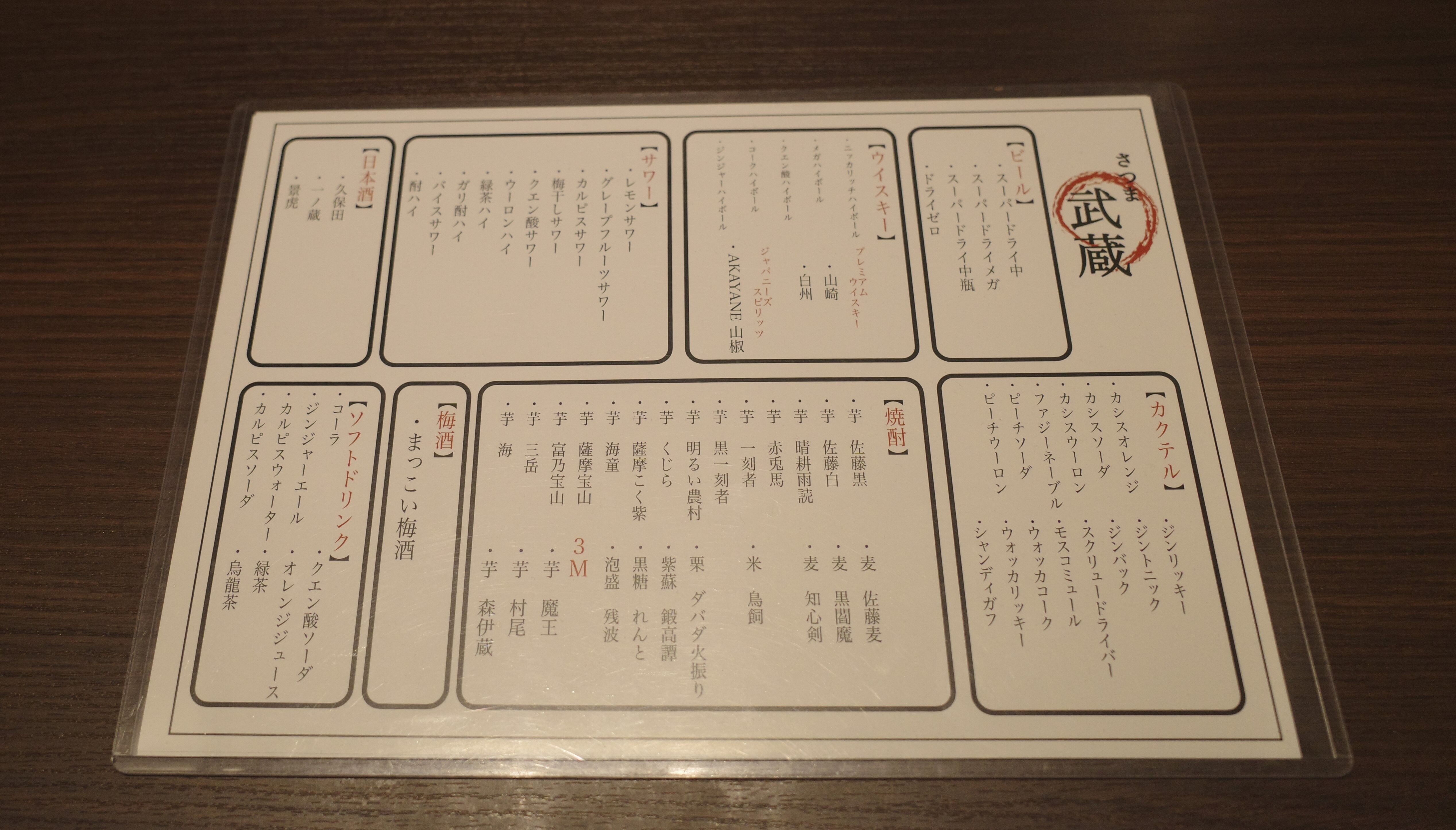 ビール、ウィスキー、サワー、日本酒、カクテル、焼酎、梅酒、ソフトドリンク。