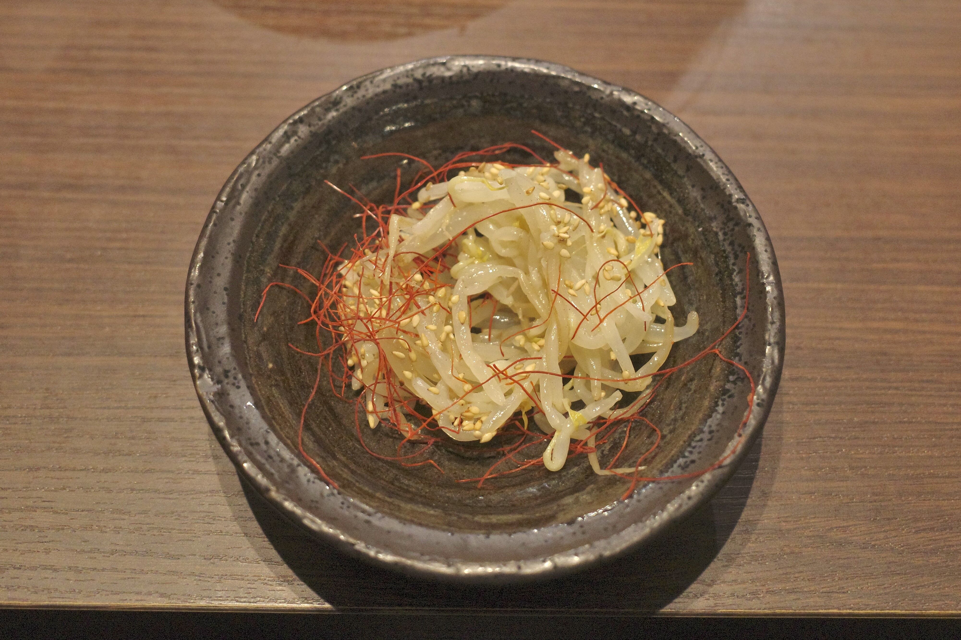 お通しは糸唐辛子の辛味をまとう「もやしのナムル」的な一品で、シャキシャキとした茹でたもやしに塩気が乗って中々美味!