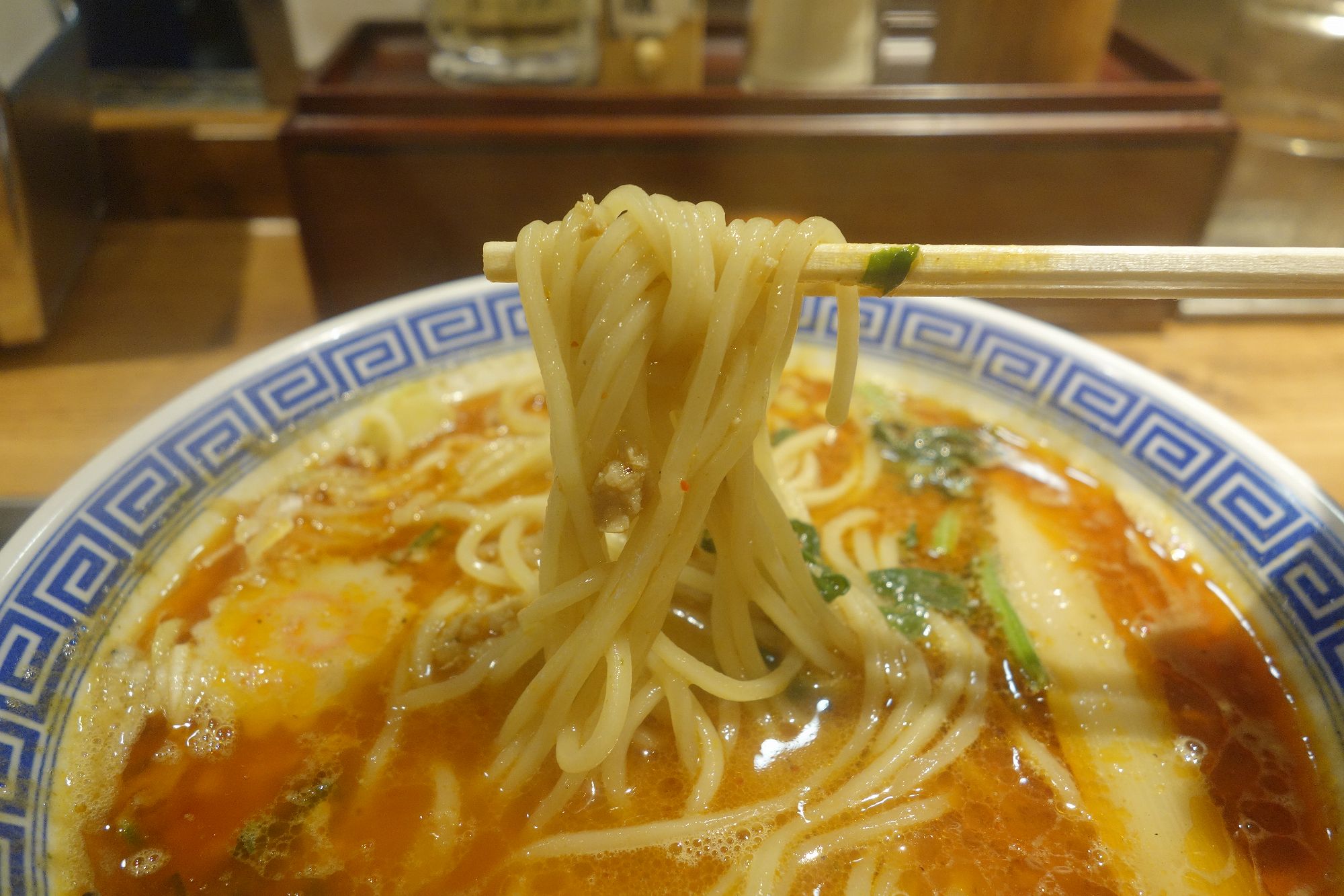 まずは麺から食べてみると、中太麺はモチモチ食感で、辛めなスープとの相性も良好。