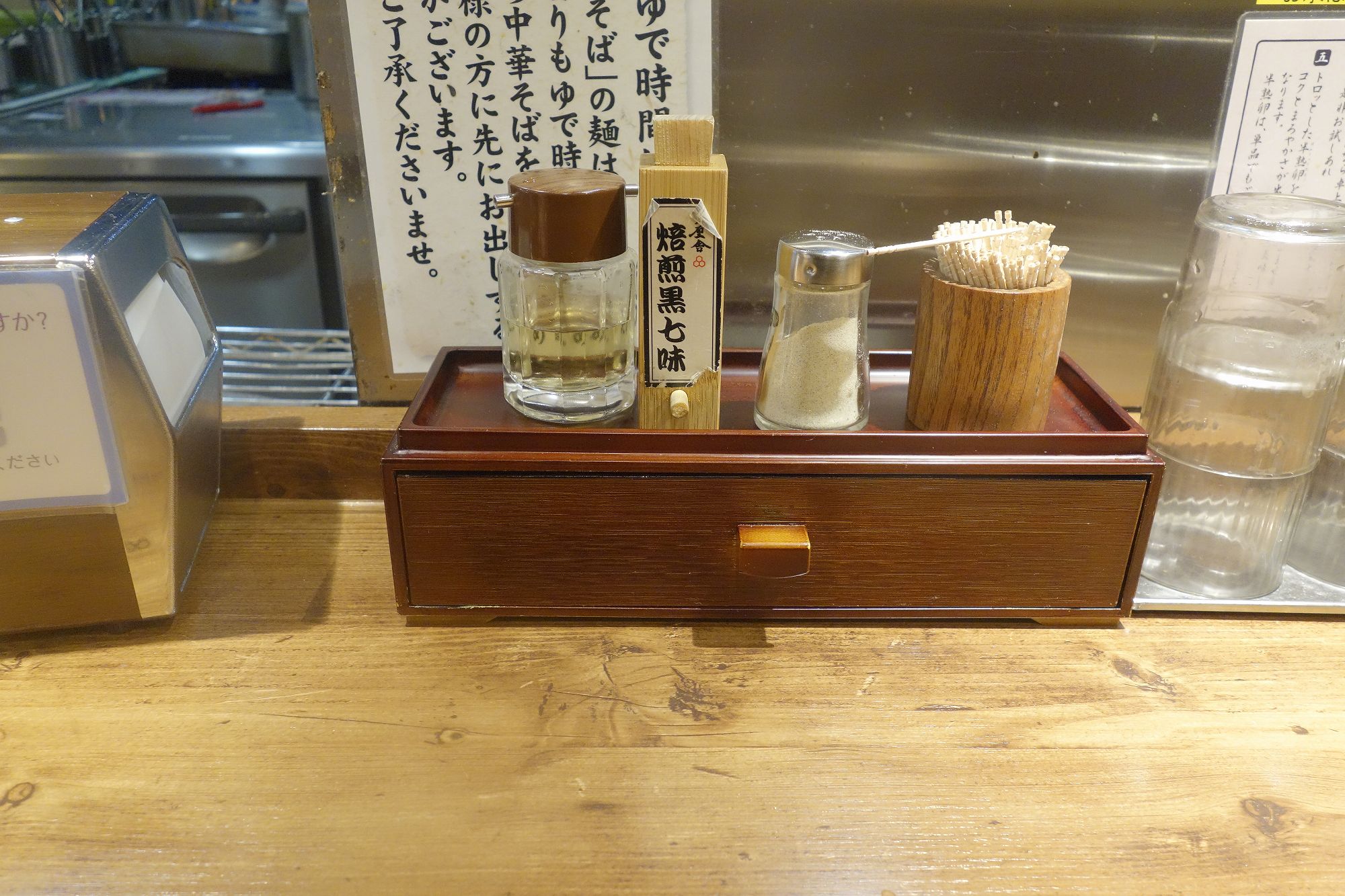 この日は担々麺590円を注文。しばし箸置き場や、焙煎黒七味の姿を見て待っていると