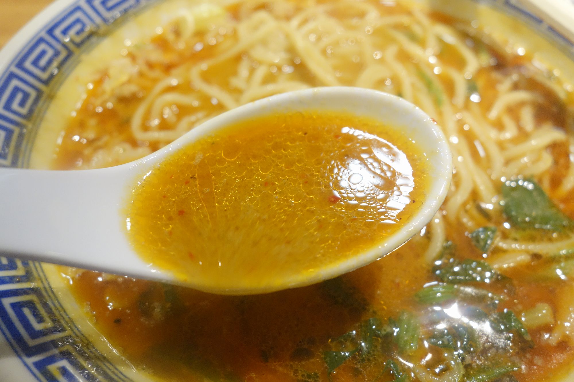 その後スープ単体で味わってみると、唐辛子の辛さと胡麻のコクが感じられ、中にはほうれん草やメンマの他に、ひき肉とネギがたっぷり。さらに黒七味を入れることで痺れる辛さが驚異的に高まります。