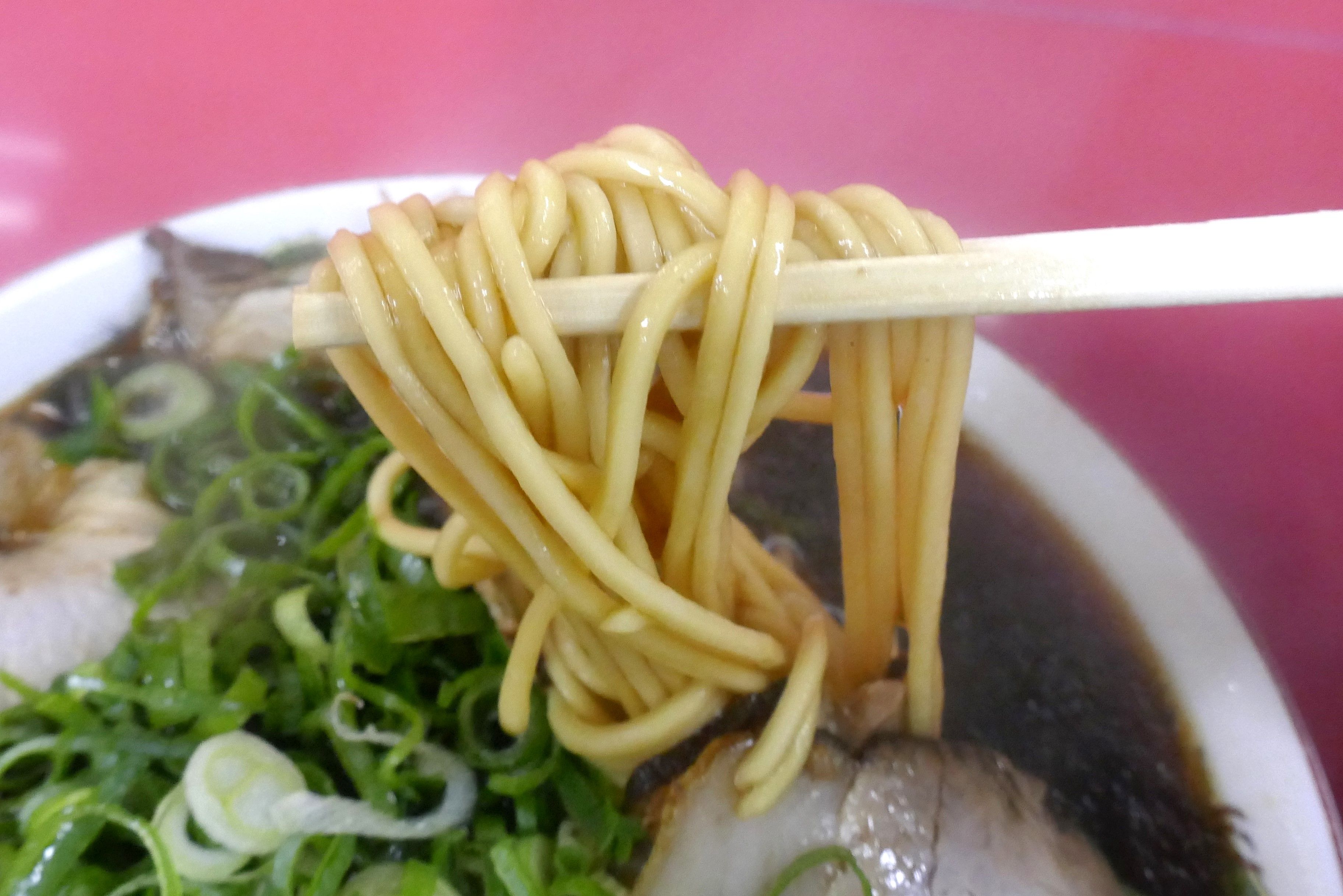 スープは「富山ブラック」などを彷彿とさせる黒々とした色みながらも塩気がマイルドな上に旨味も十二分でうまし!脂っこさが控えめなので朝からガツガツと食らえるのも好印象!
