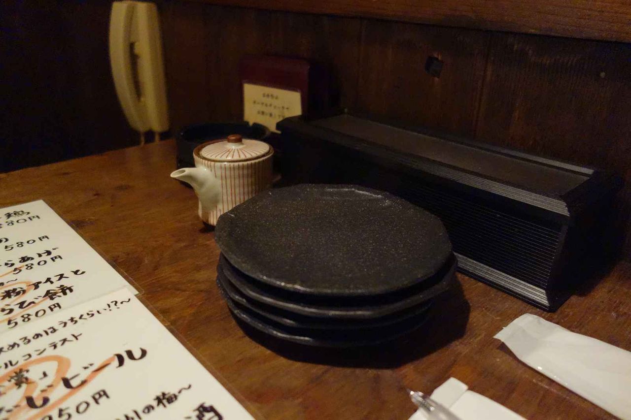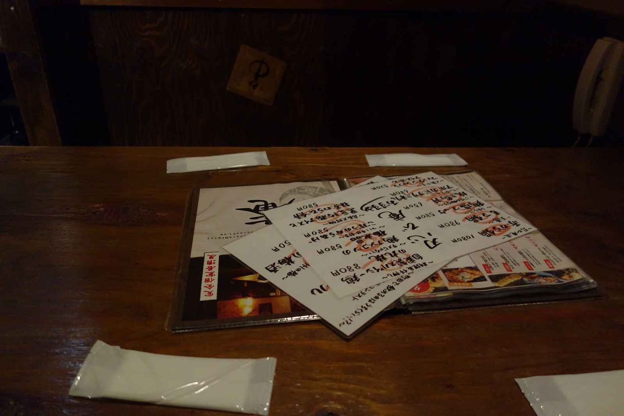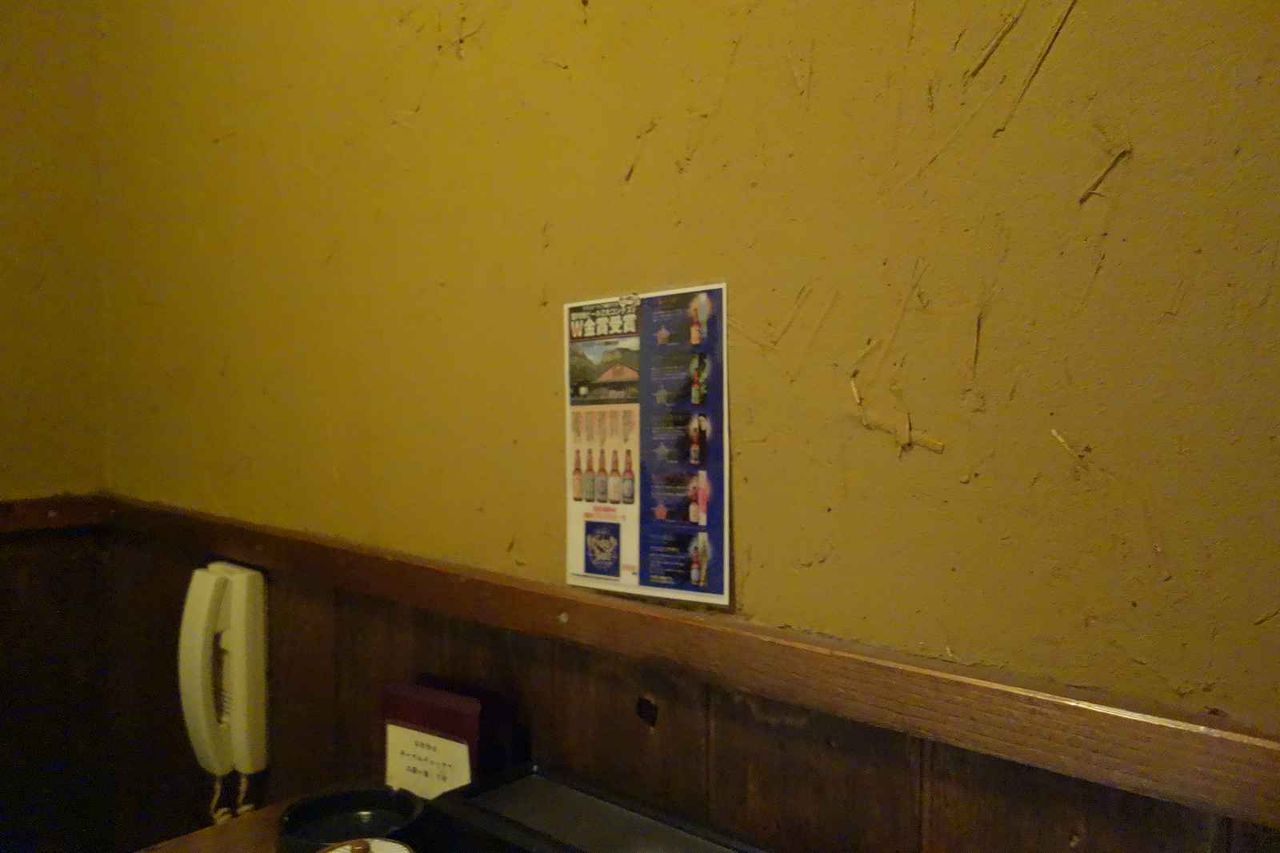 お酒メニューと共に、呼び鈴が電話なのはカラオケの居抜きかな?と思いつつ