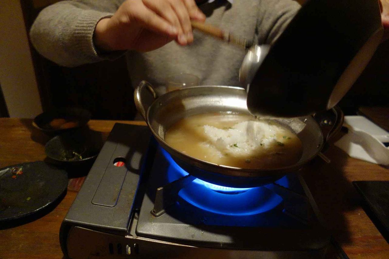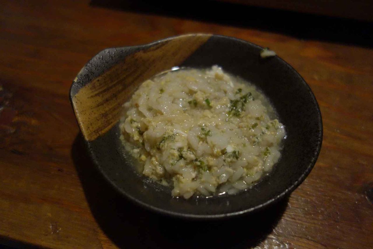 程なくして完成した雑炊を頂いてみると、塩もつ鍋の出汁が染み込んだとあって