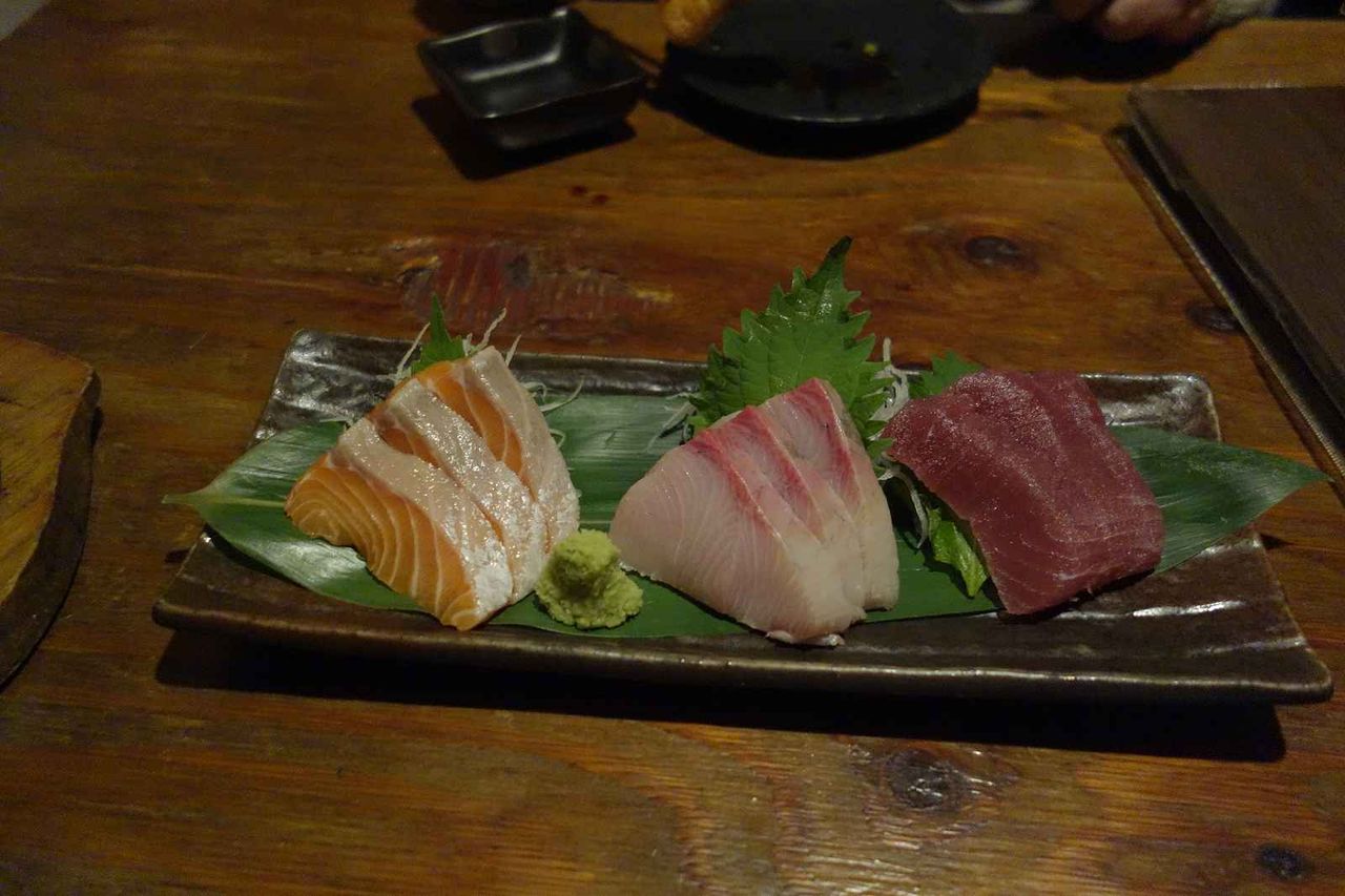 サーモン、はまち、まぐろの刺し身は意外なほど肉厚で