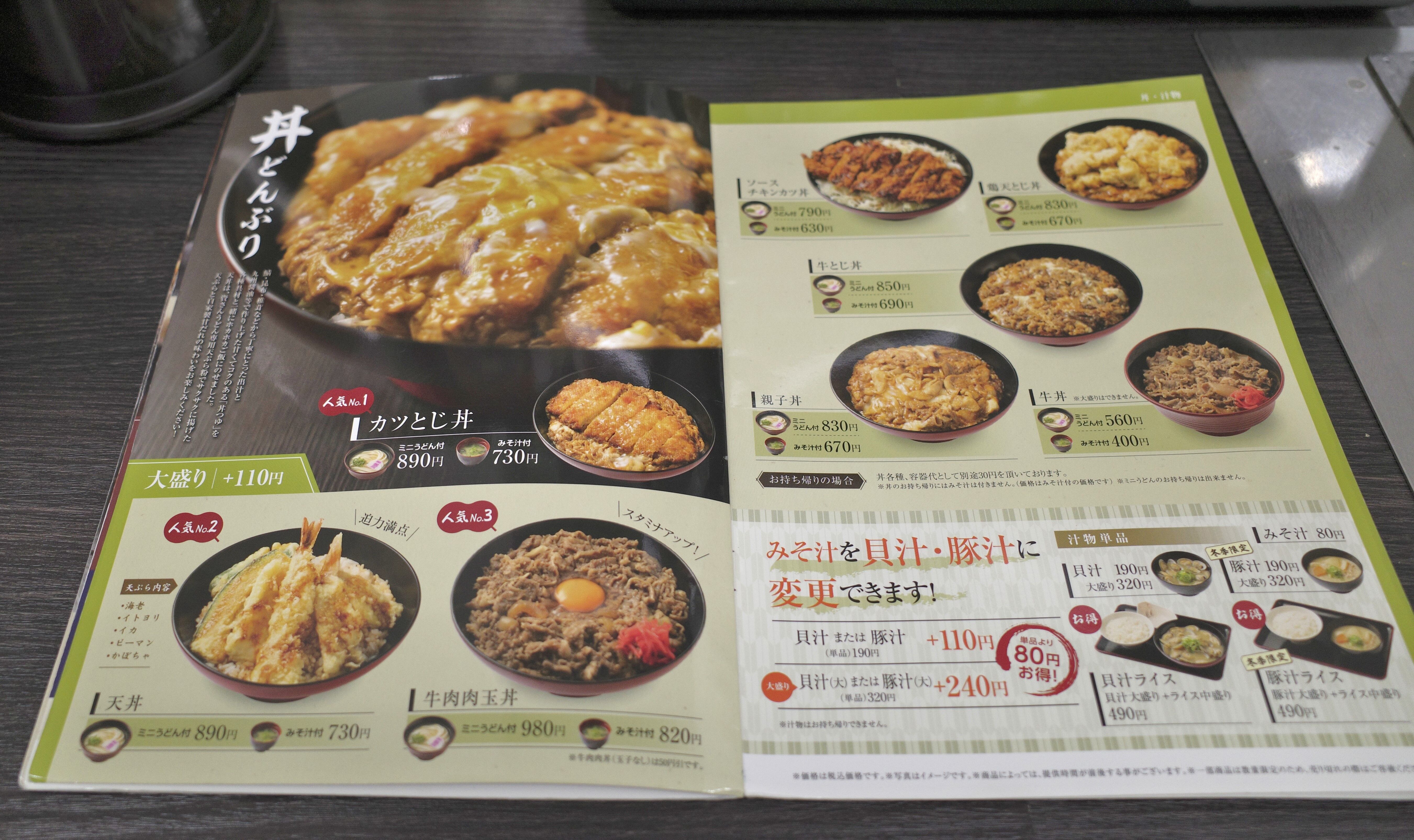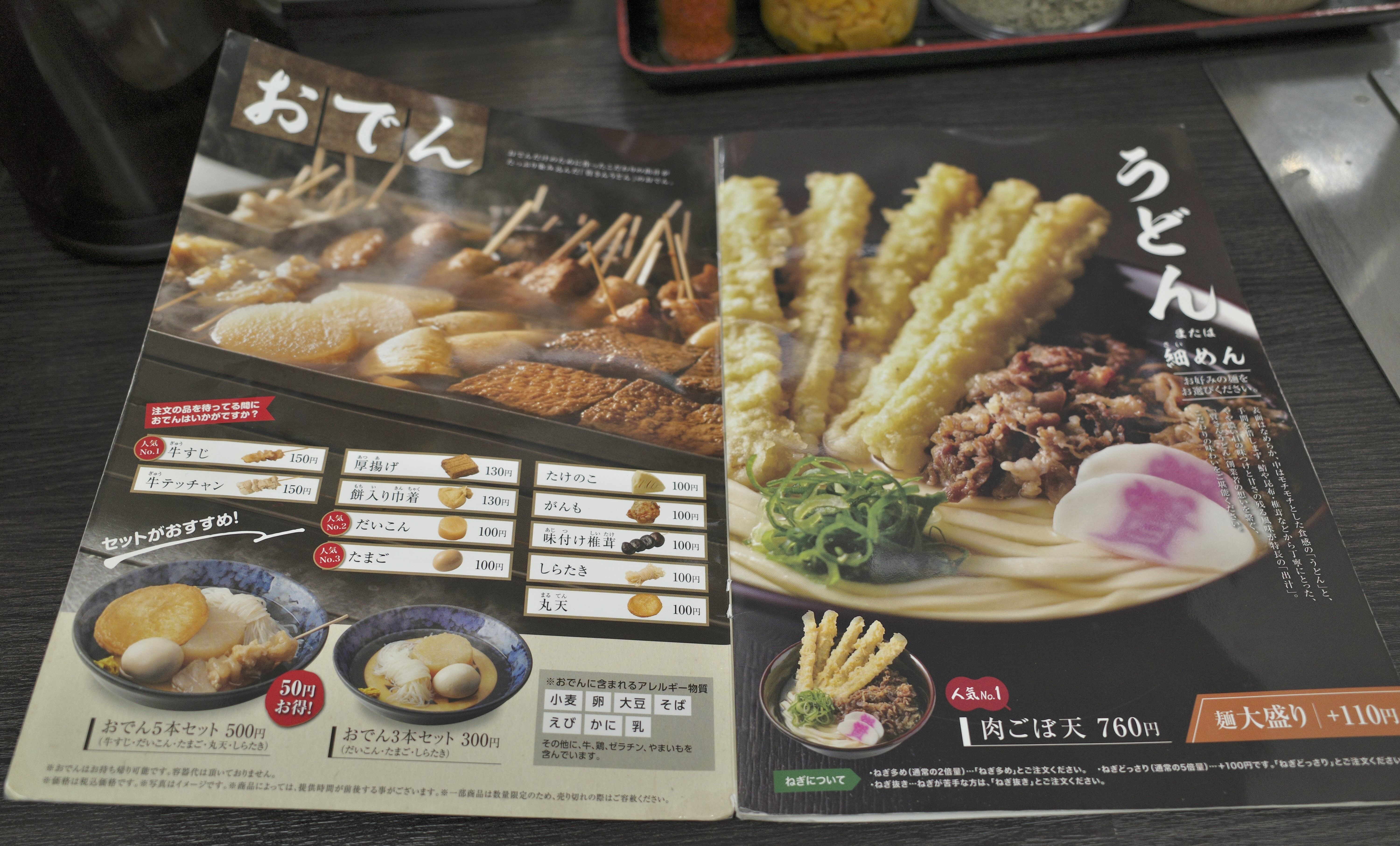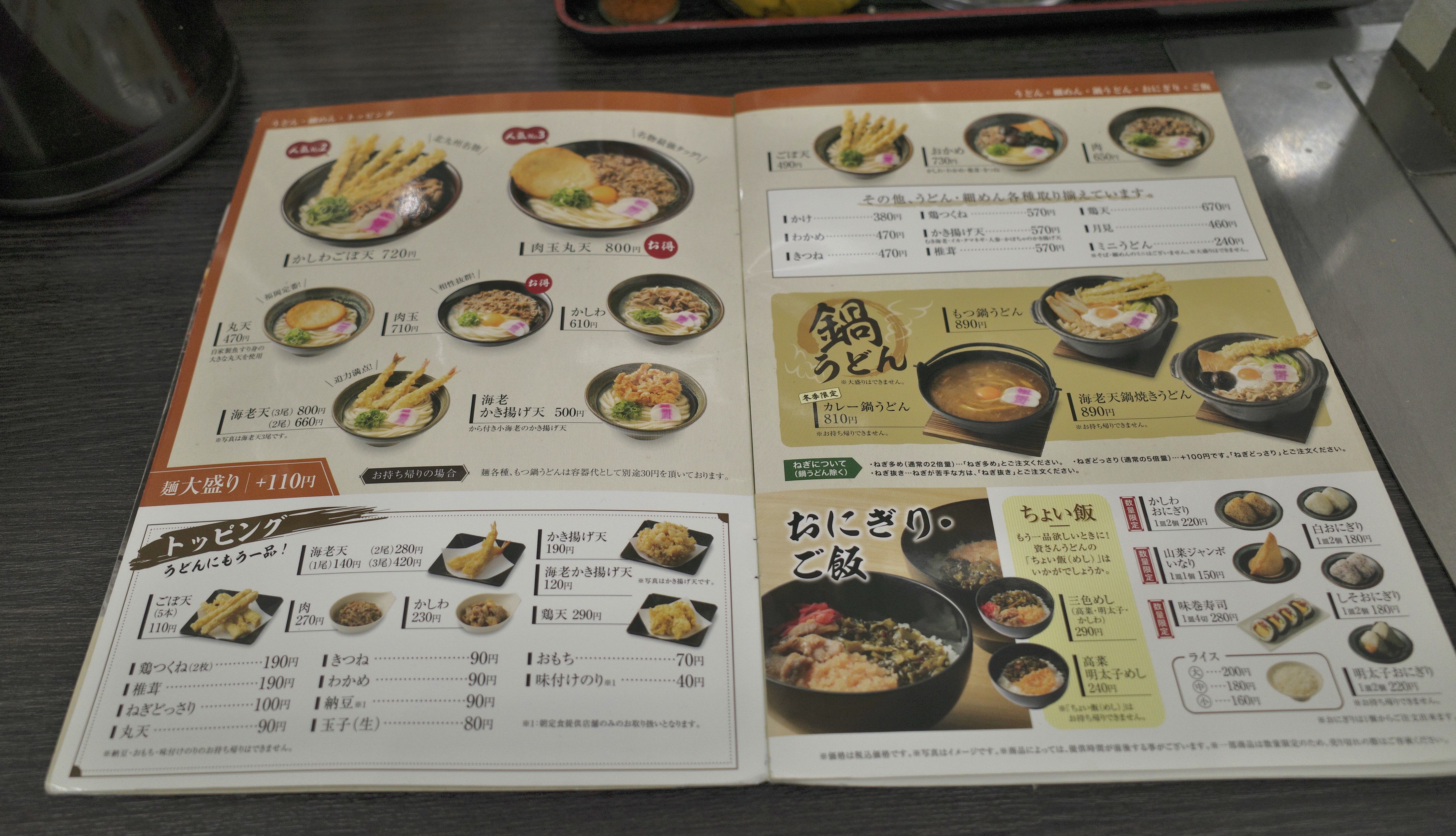 各種うどんメニュー、トッピングメニュー、おにぎり・ご飯。