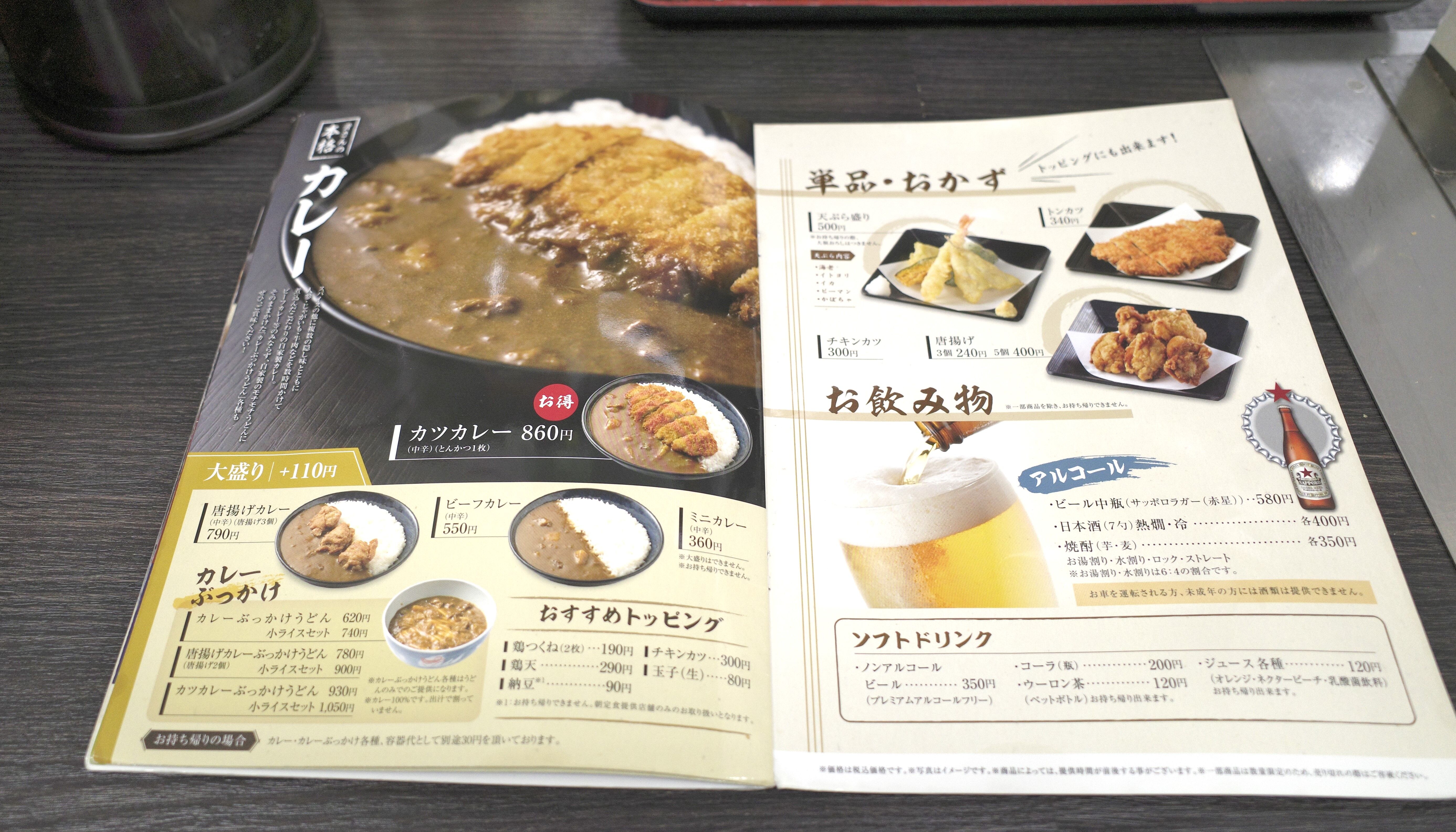 カレーメニュー、おかずメニュー、ドリンクメニュー。