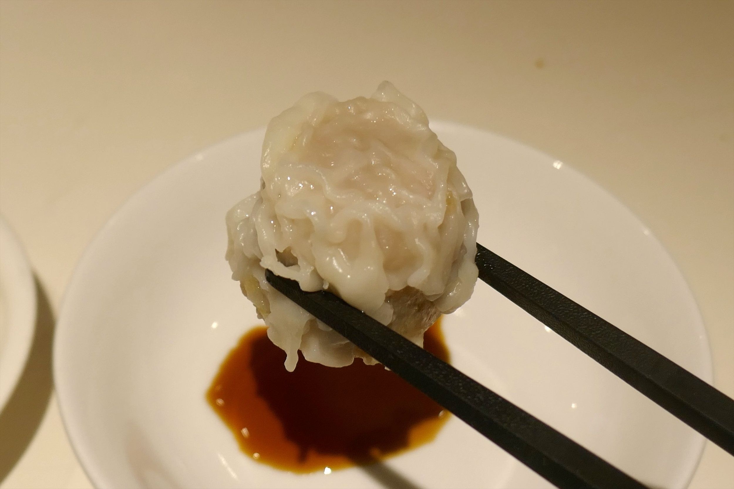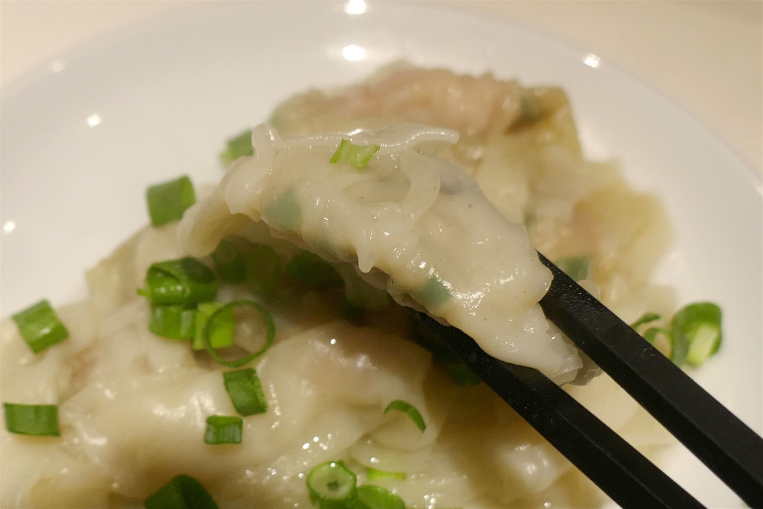 いざ、「つけワンタン」にかぶりつくと、皮は薄く柔らかで中のエビはぷりっぷり!爽やかジューシーなエビの風味が口の中にブワーッと広がります!