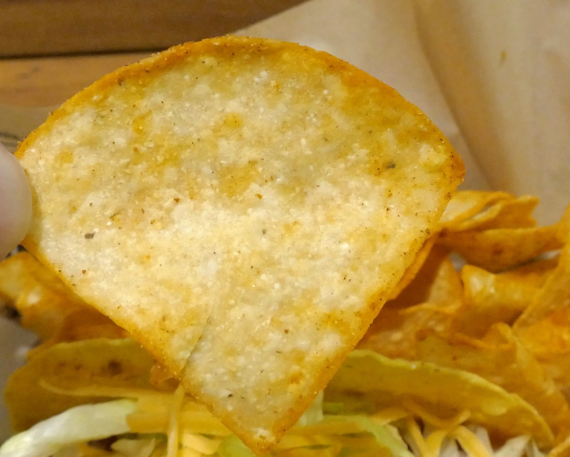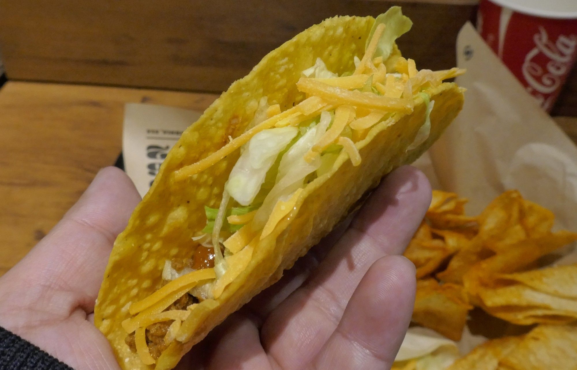 ハードな食感繋がりでハードシェルタコスを食べてみると、パリパリ感満点なシェルの食感のあとに、フレッシュな野菜の風味、チーズのコク、パワフルなビーフの美味しさ大爆発!