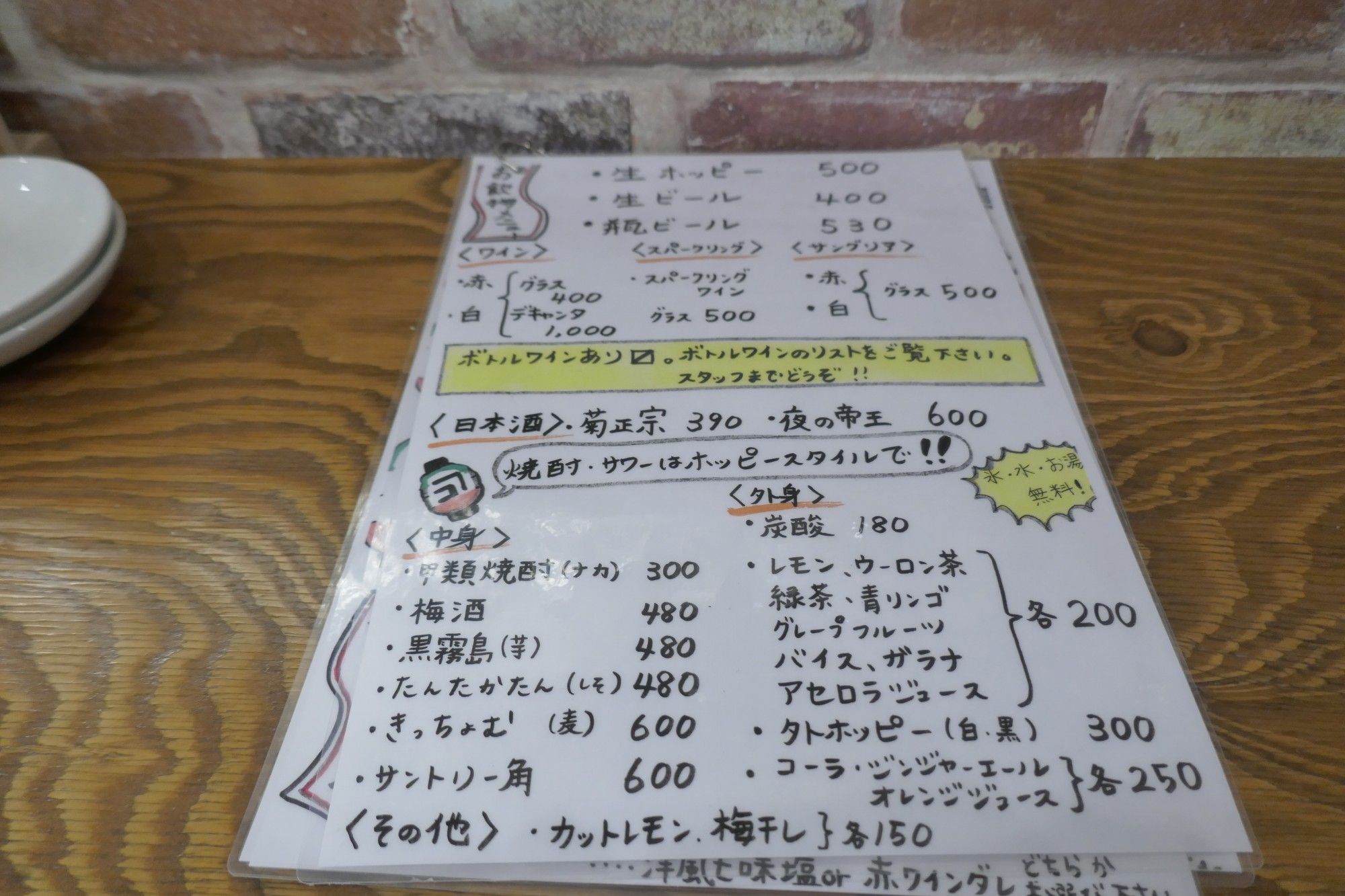 メニューを見ていくとホッピー、ビール、グラスワイン、サングリア、日本酒、焼酎、サワー