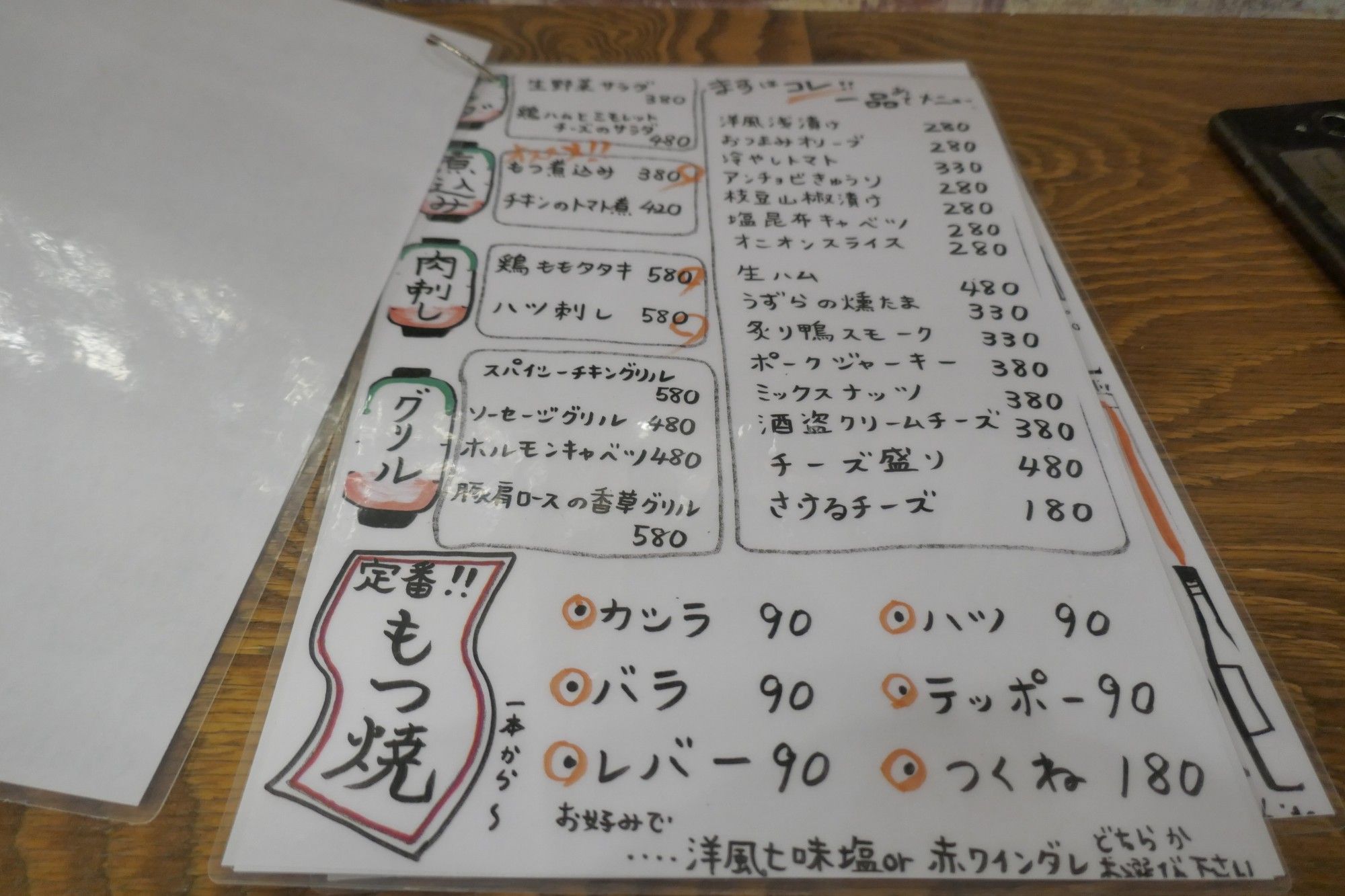 サラダ、煮込み、肉刺し、グリル、もつ焼き、各種おつまみメニュー