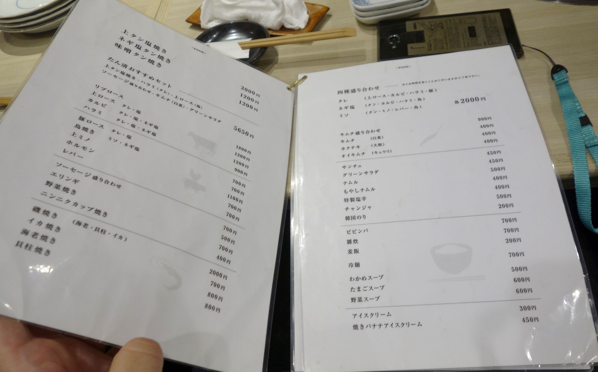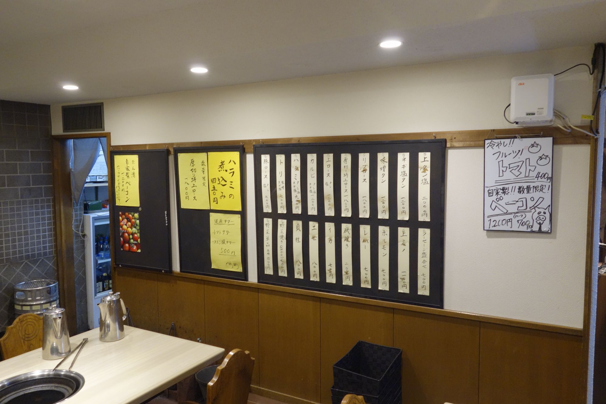 メニューはタン、ロース、ホルモン、野菜、海鮮、肉盛り合わせ、キムチ、おつまみ、ご飯、スープ、スイーツ