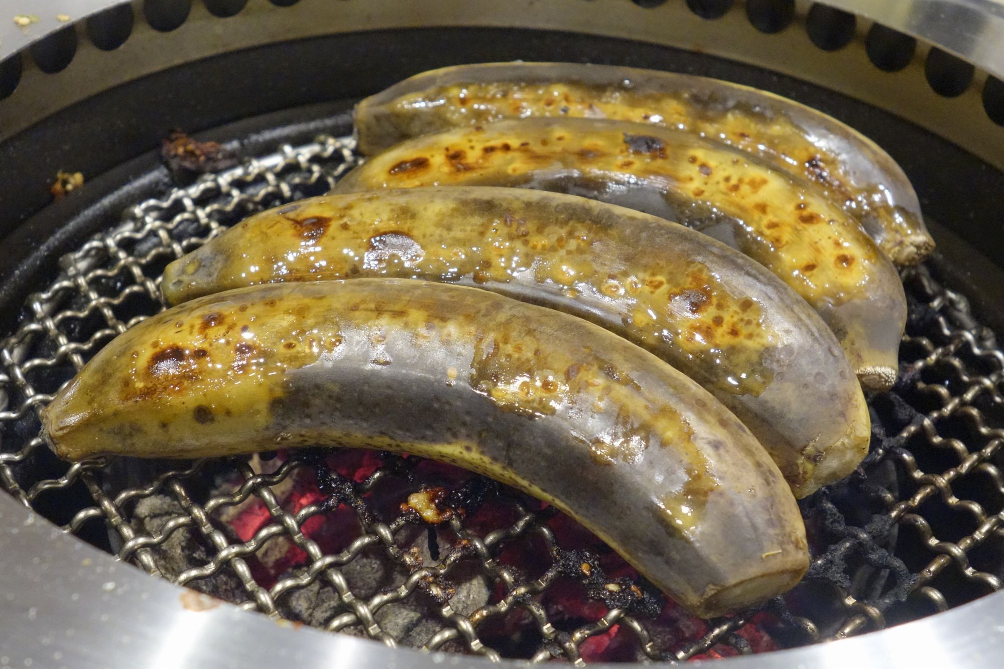 締めのデザートは焼きバナナアイスクリーム450円。まずは金網の上でバナナを焼いていき