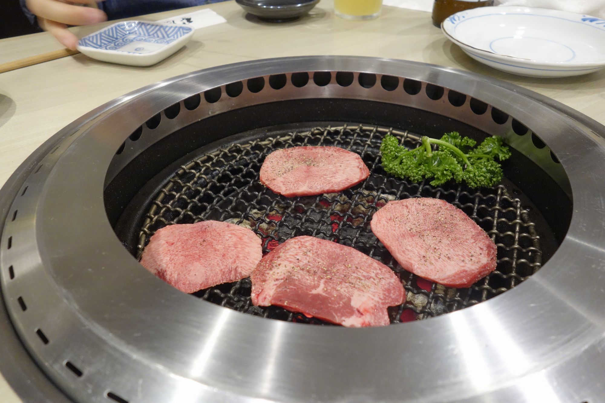 早速分厚く上タン塩を金網の上で焼き