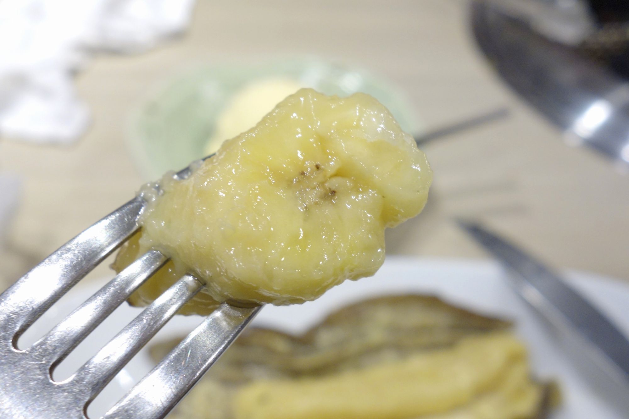 まずは器用にナイフとフォークでバナナの皮と身を分離させ