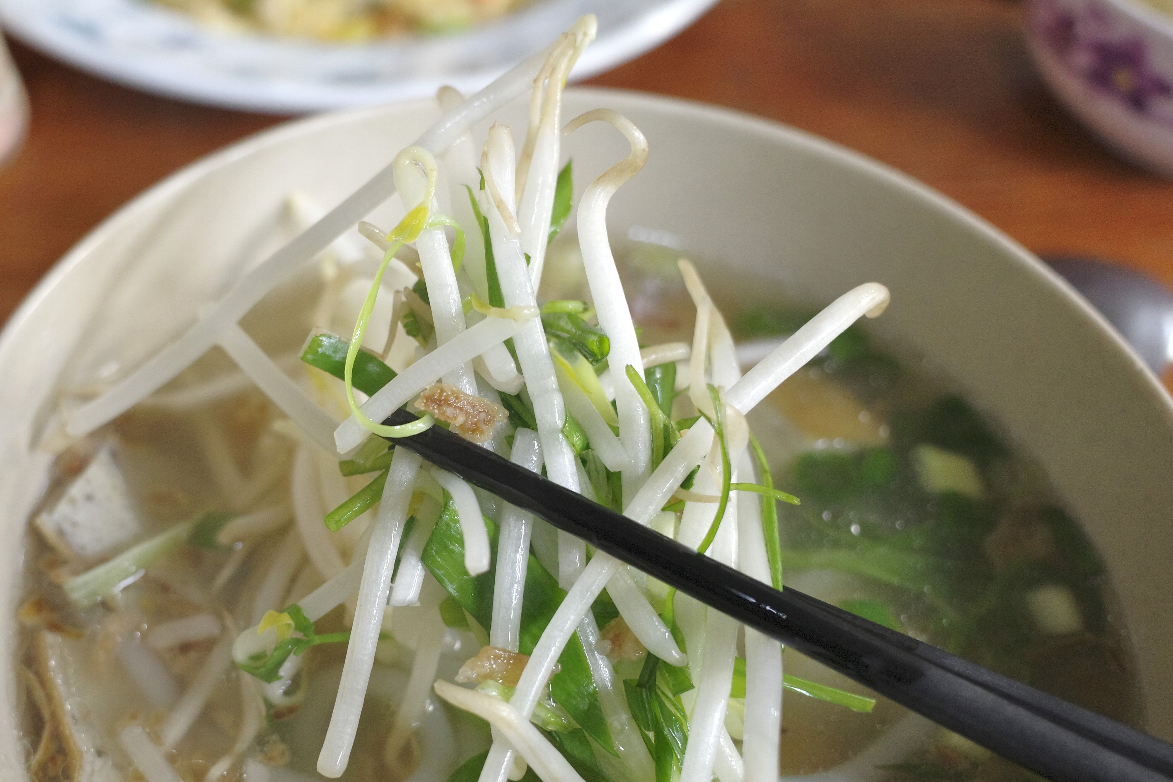 追加のもやしやねぎなどの野菜、パクチーの爽快感、鶉の卵も入ってお腹の満足度もグッド!