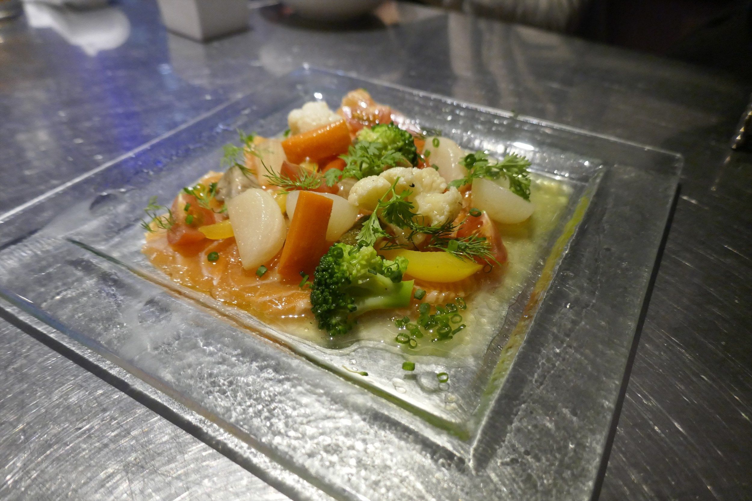 最初に注文した「サーモンのカルパッチョ」は、具だくさんなカルパッチョで
