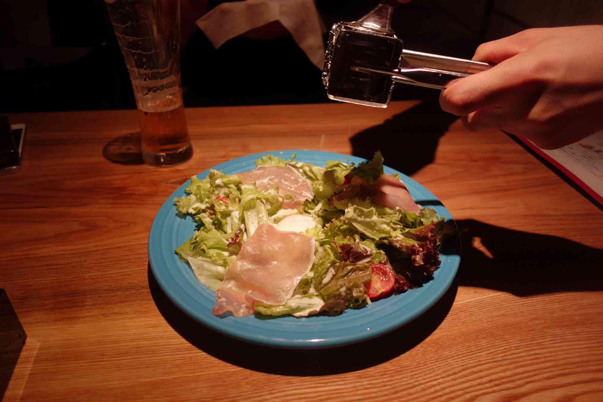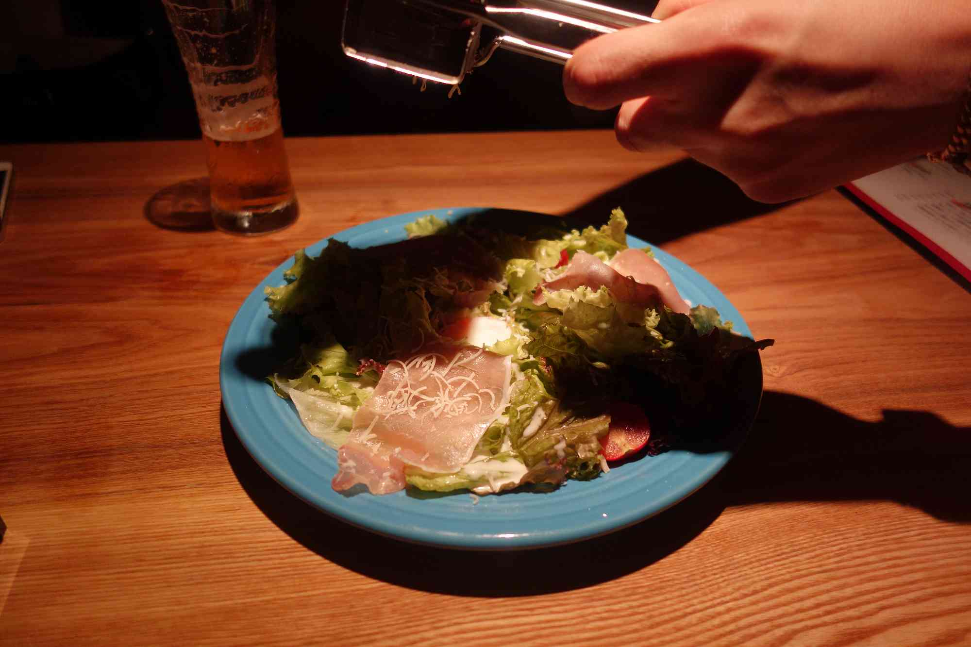 チーズを店員さんおすすめ量まで入れてもらい温泉卵と生ハムのシーザーサラダが完成です。