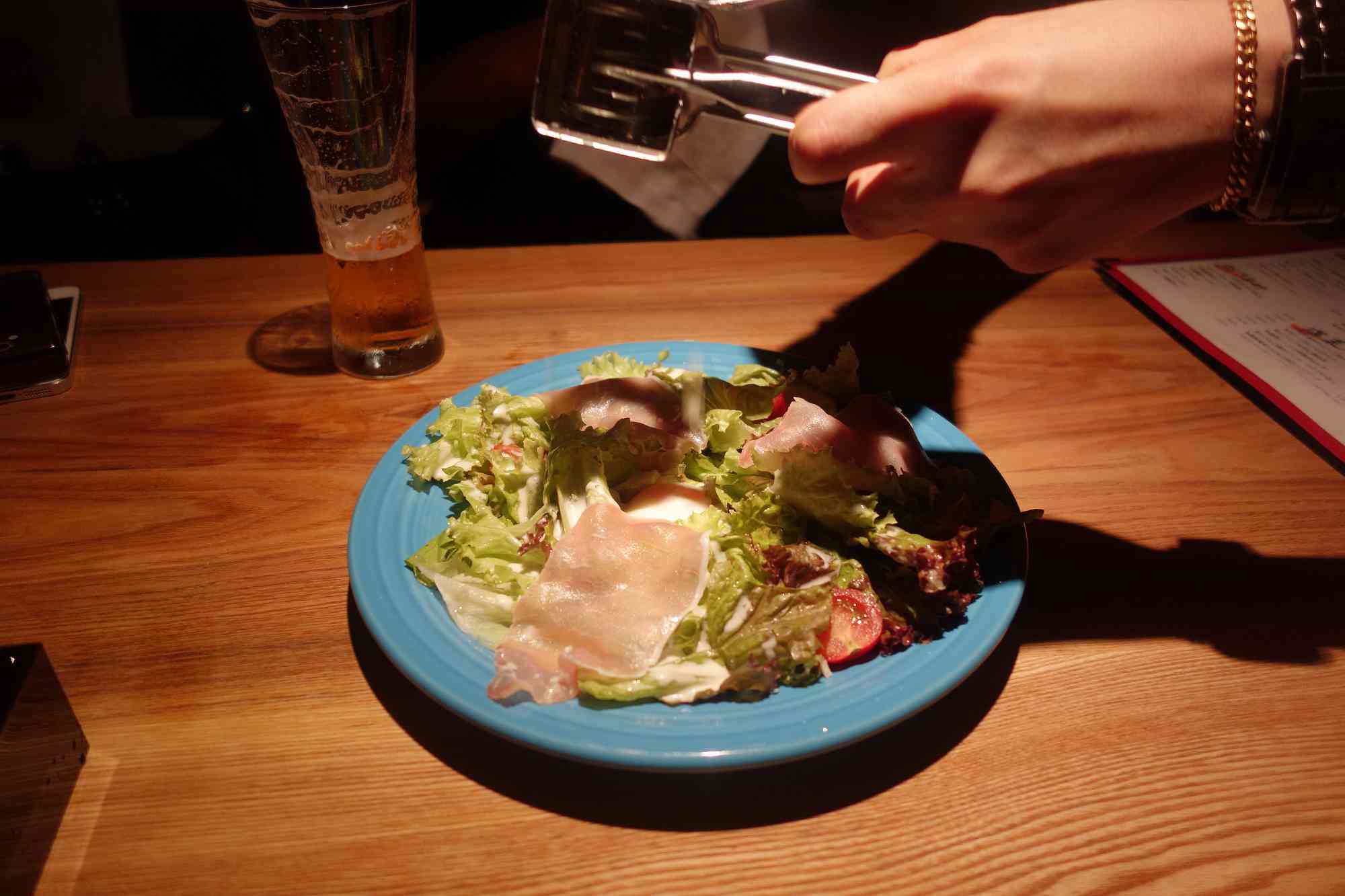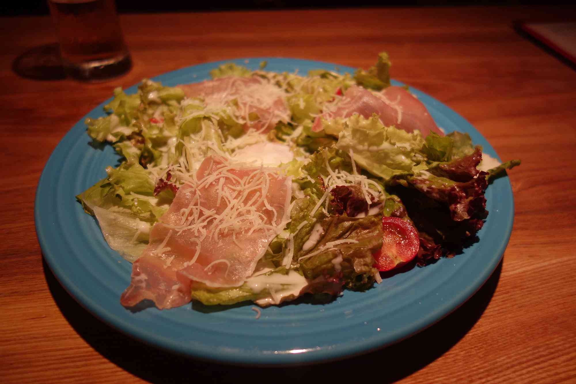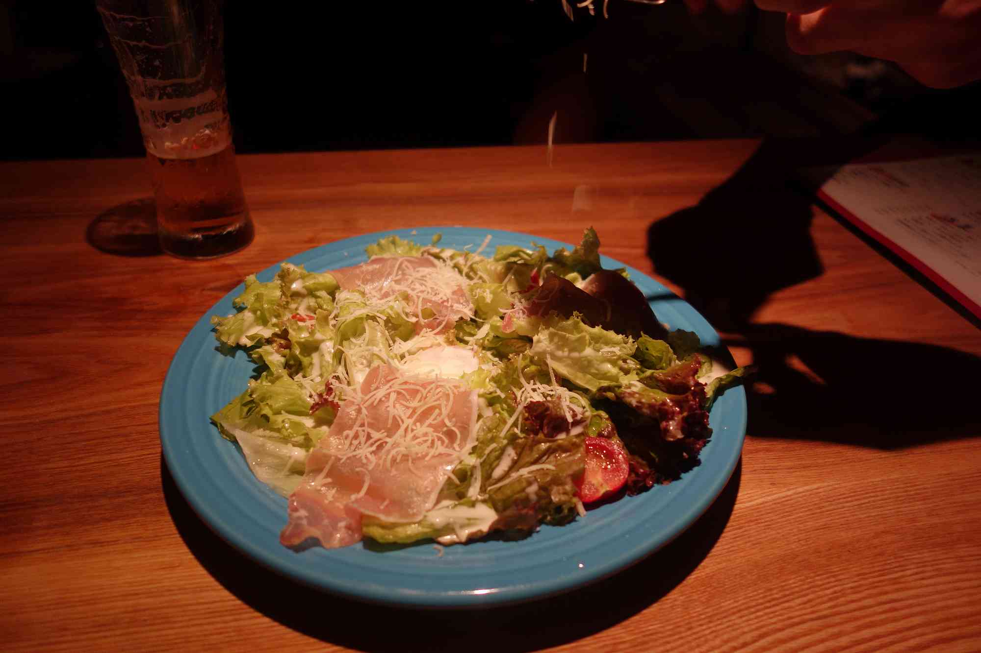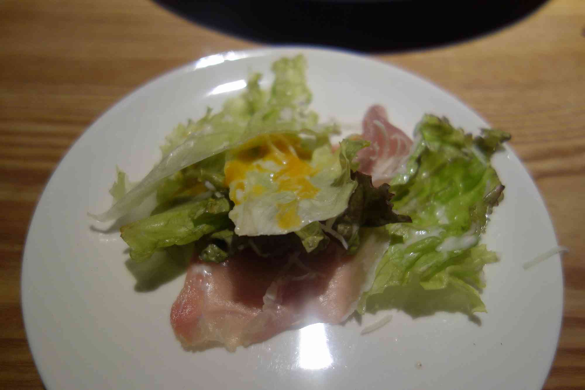 その後は前菜代わりに頂いた、温泉卵と生ハムのシーザーサラダ780円が運ばれ