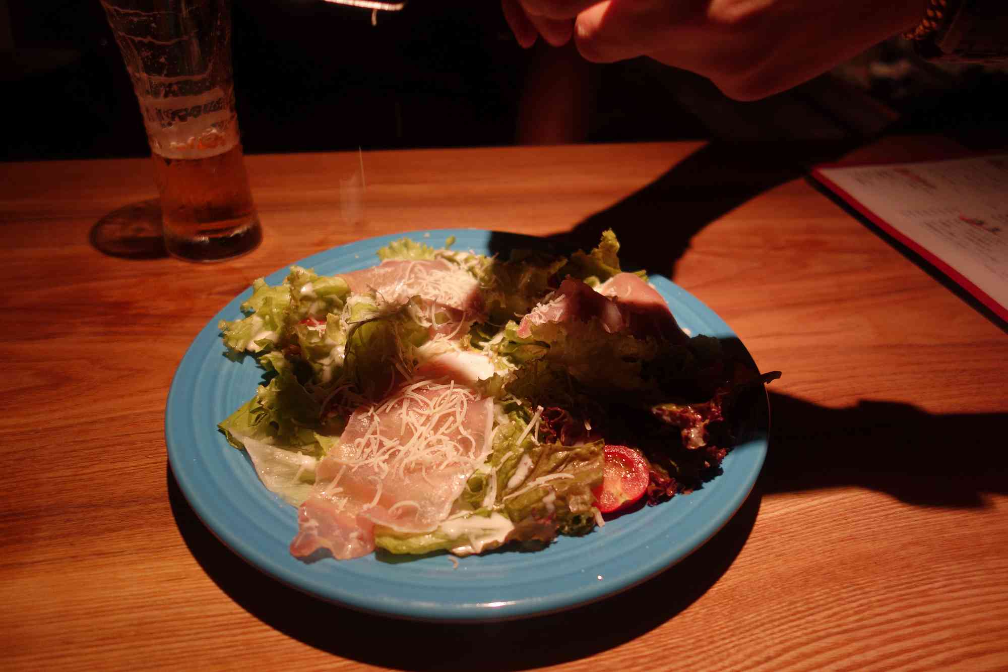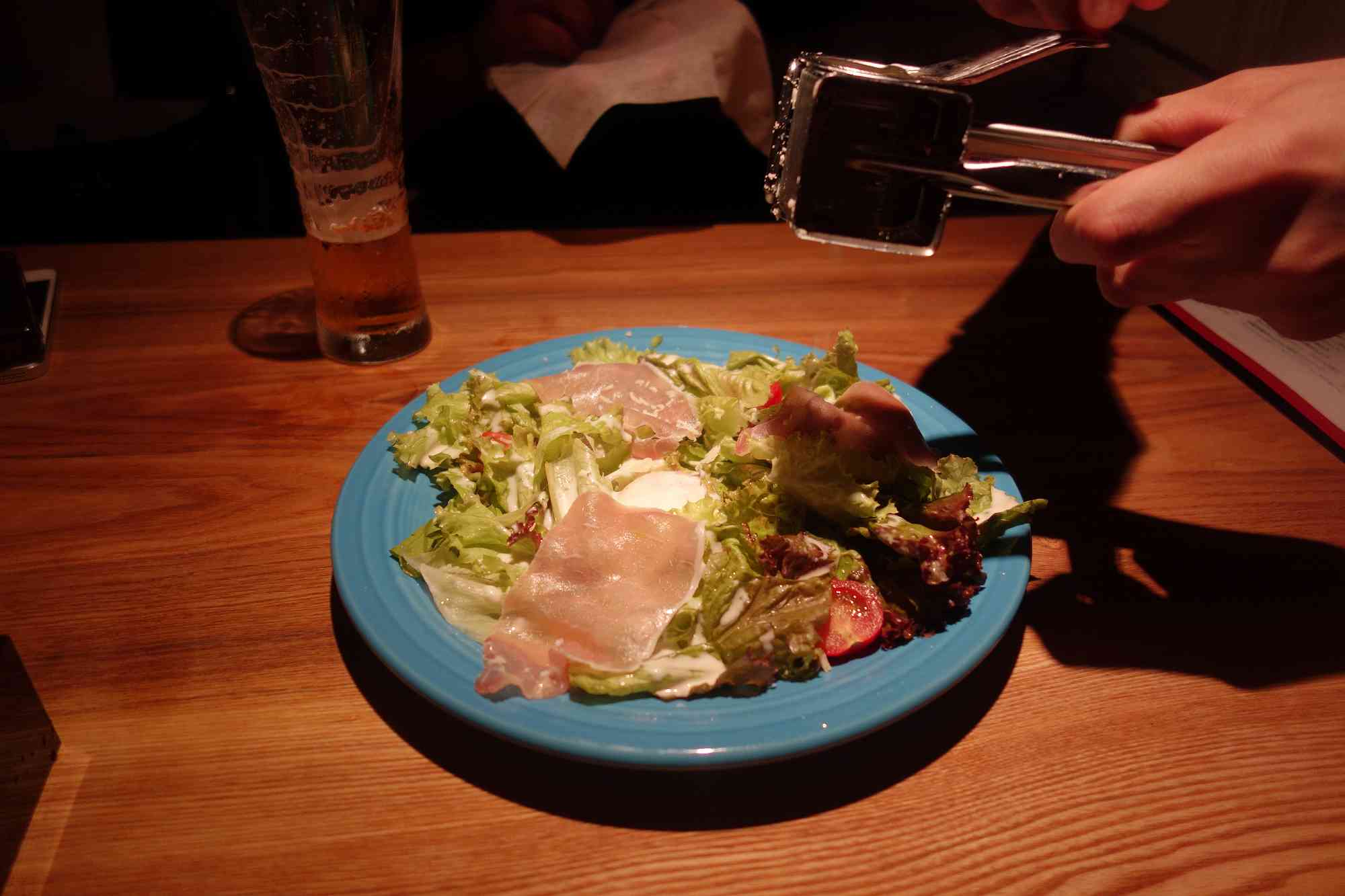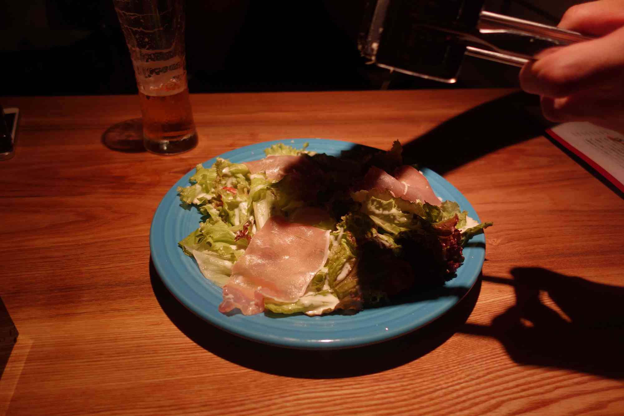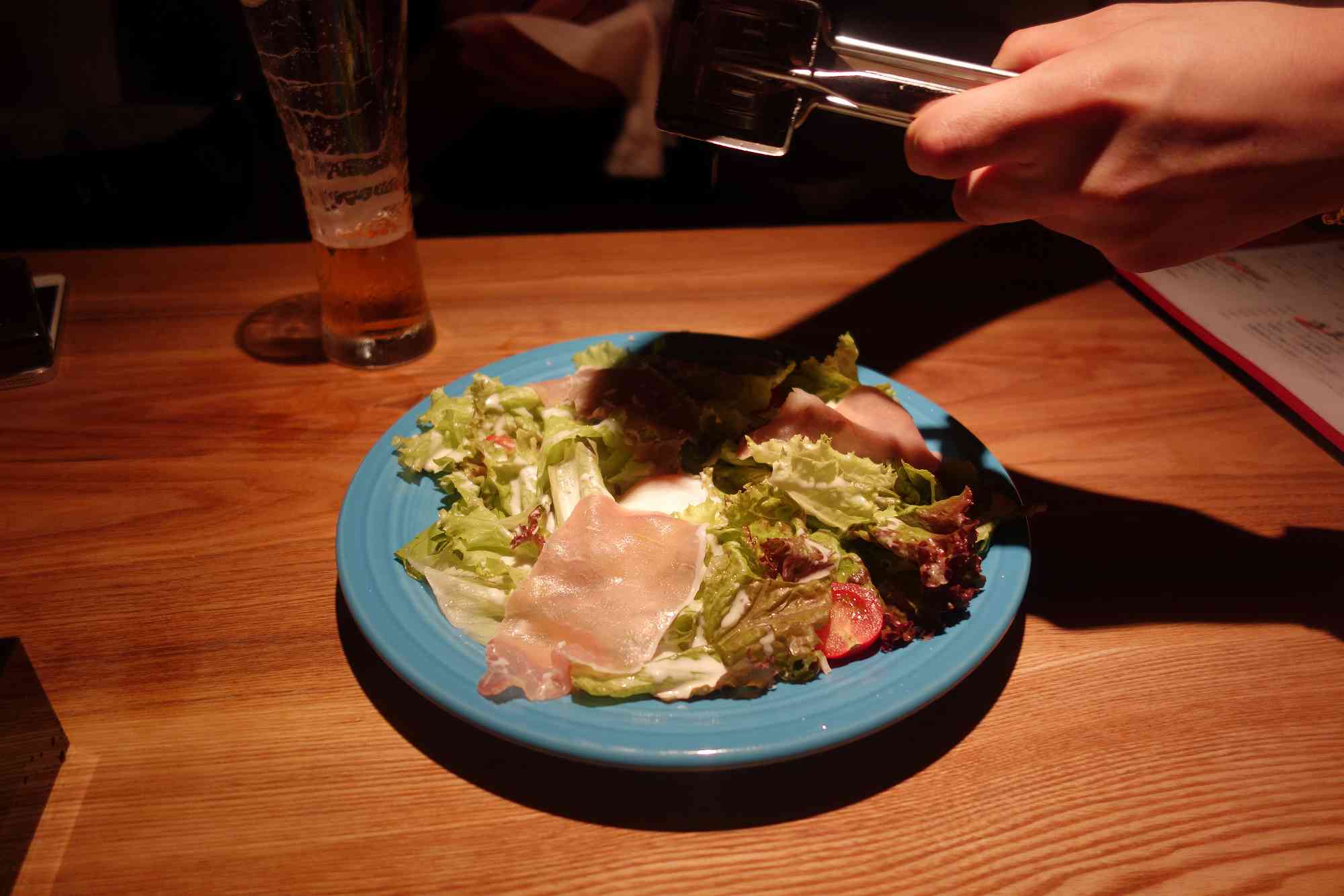 その後は前菜代わりに頂いた、温泉卵と生ハムのシーザーサラダ780円が運ばれ