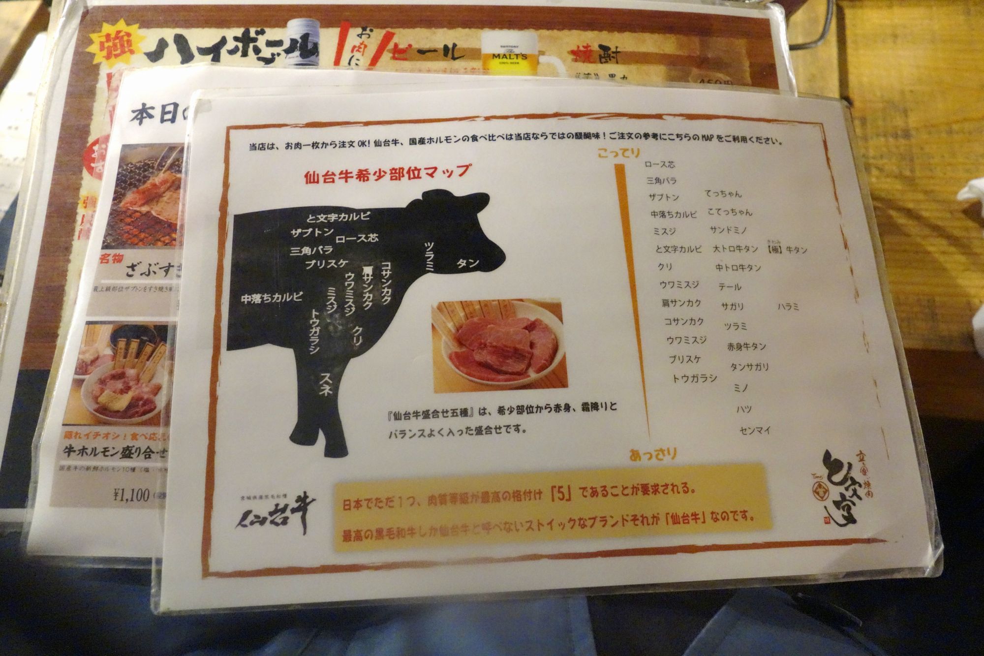 仙台牛の部位マップや、仙台牛のクオリティの高さを示したPOP