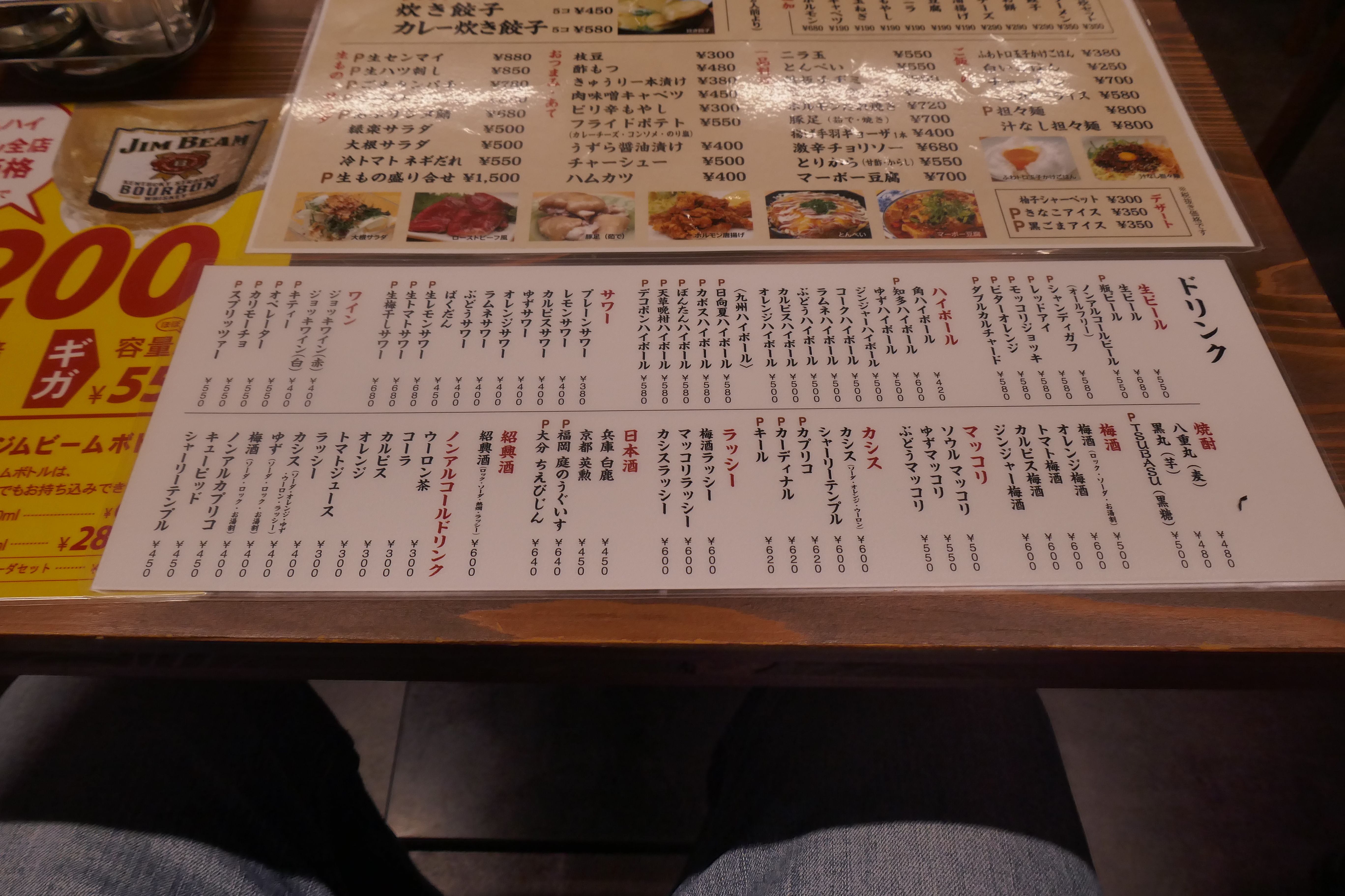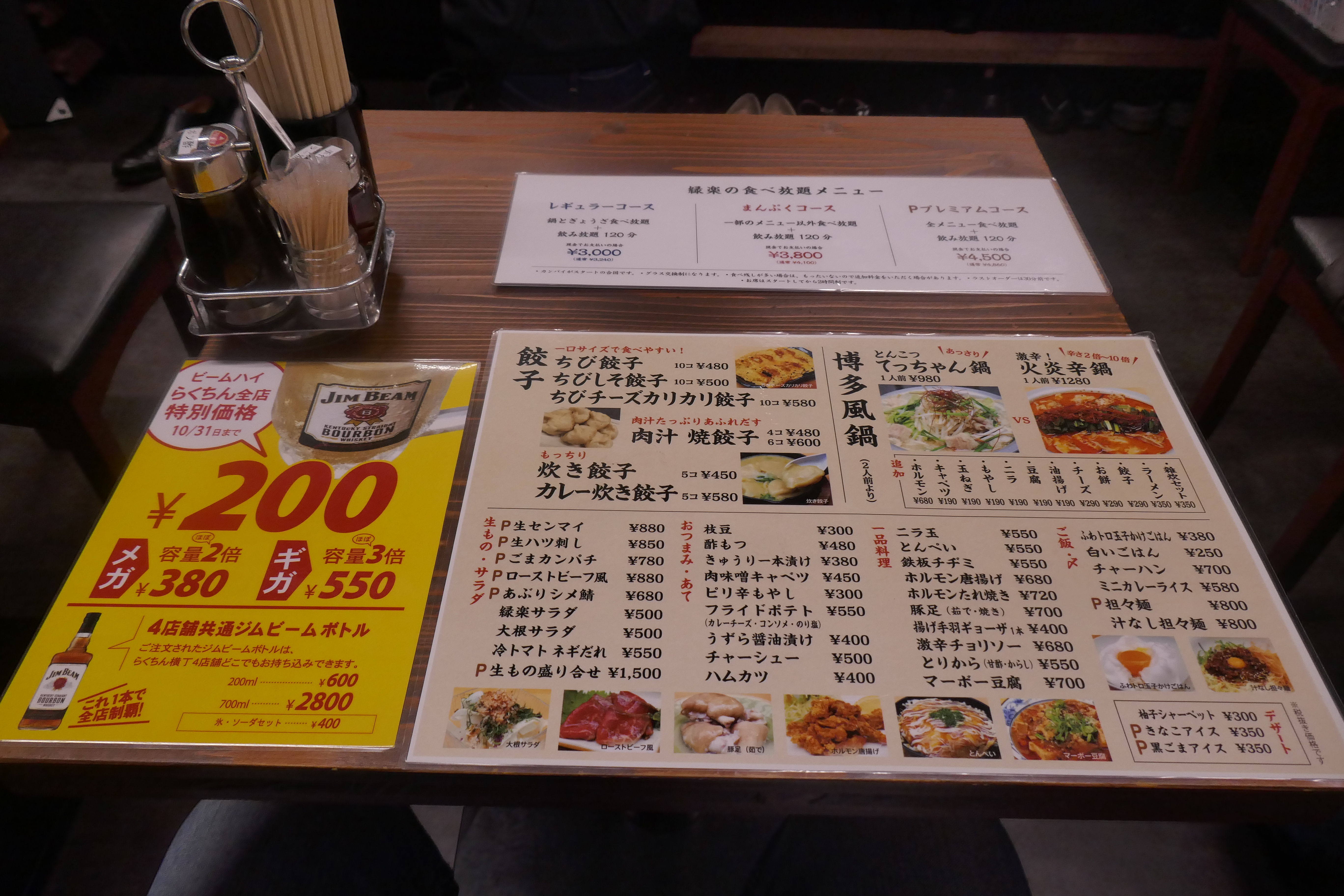メニューは餃子、博多風鍋、サラダ、おつまみ、一品料理、ご飯物、デザートに加えて、別紙メニューとしてメガ&ギガハイボールが!