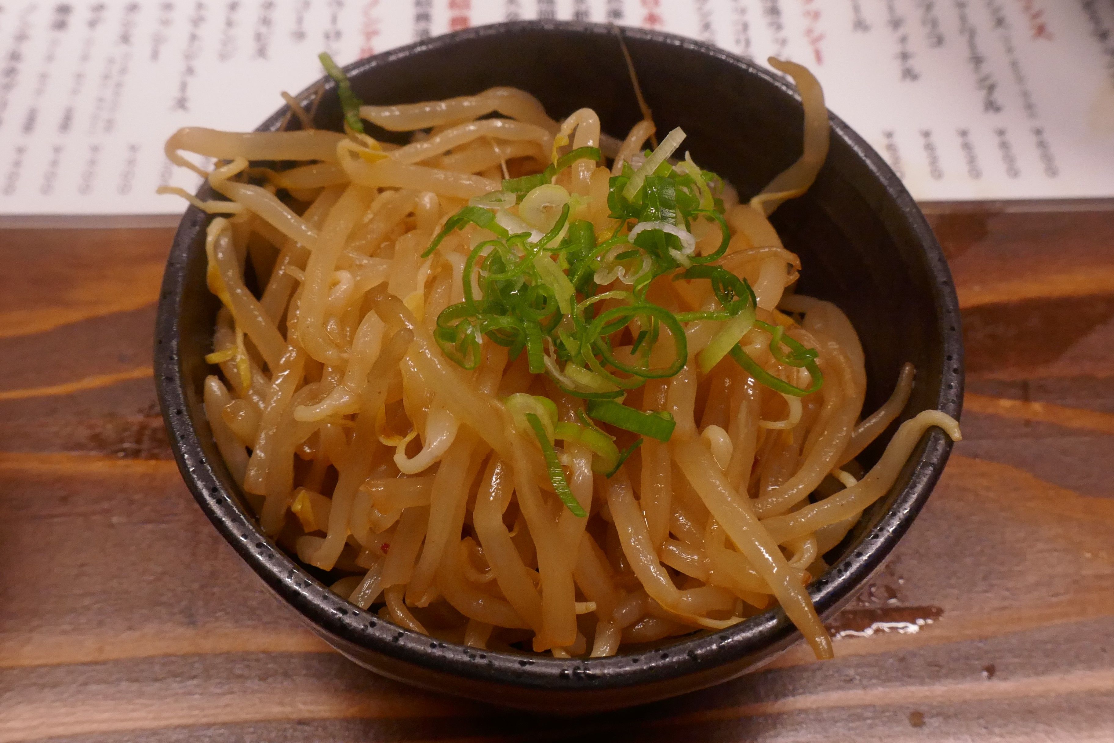 シャキシャキとした茹でもやしと、ピリ辛な風味が入り交じる「ピリ辛もやし」300円。